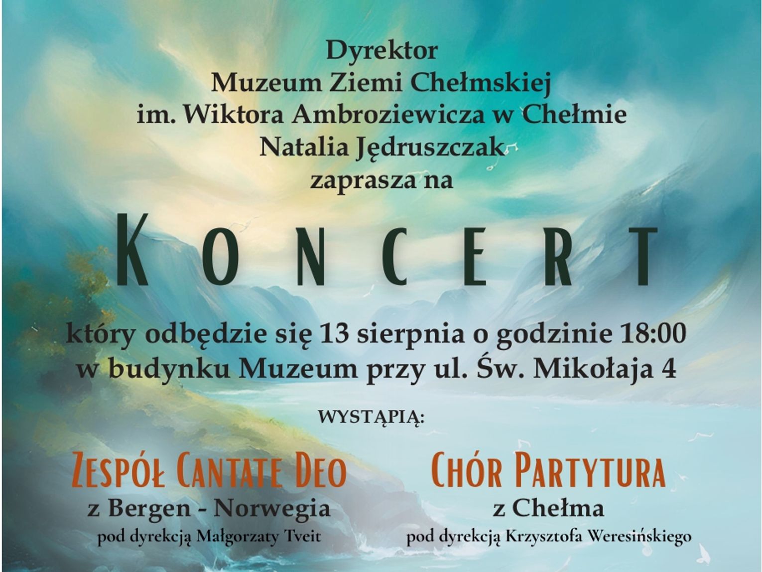 Koncert ten stanowi wyjątkową okazję do wysłuchania różnorodnych utworów w wykonaniu dwóch utalentowanych zespołów. Zespół Cantate Deo, prowadzony przez dyrygent Małgorzatę Tveit, gości w Chełmie, by zaprezentować swój repertuar. Równocześnie, publiczność będzie miała przyjemność usłyszeć Chór Partytura pod kierownictwem Krzysztofa Weresińskiego, który jest dobrze znany lokalnej publiczności. Połączenie dwóch chórów z różnych krajów z pewnością dostarczy słuchaczom niezapomnianych wrażeń muzycznych.