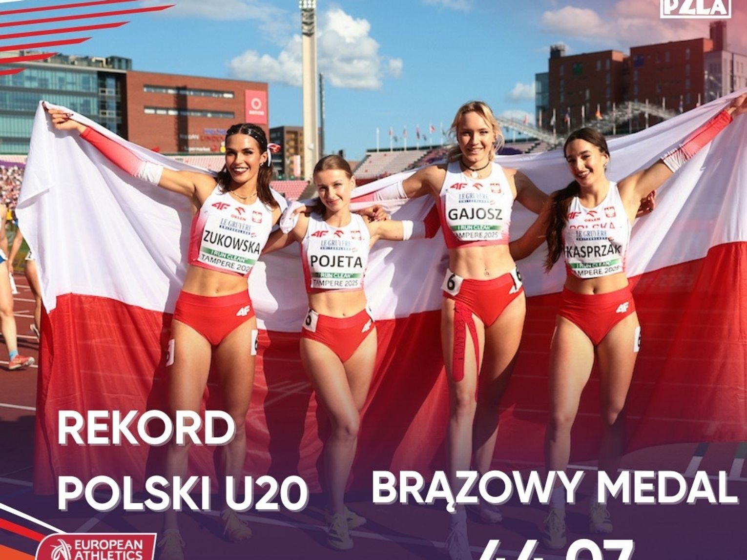Czasem 44,07 sek. Wiktoria Gajosz, Małgorzata Pojęta, Oliwia Kasprzak i Jagoda Żukowska zapewniły sobie najniższy stopień podium w sztafecie 4x100 m, a ponadto ustanowiły nowy rekord Polski. Nasze lekkoatletki wyprzedziły rywalki reprezentujące Zjednoczone Królestwo Wielkiej Brytanii i Irlandii Północnej (43,98 sek.) oraz triumfatorki konkurencji z Włoch (43,72 sek.). W Tampere Wiktoria Gajosz startowała także w swojej koronnej dyscyplinie, czyli biegu na 200 m, jako jedna z liderek europejskich tabel.