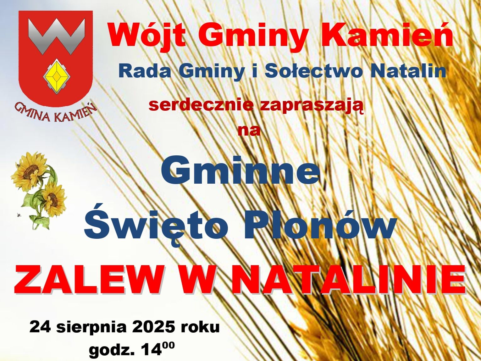 Uroczystości rozpoczną się o godzinie 14:00 korowodem dożynkowym. Następnie o godz. 15:15 odprawiona zostanie msza święta dziękczynna w intencji mieszkańców gminy. Po niej nastąpią przemówienia okolicznościowe oraz wręczenie wyróżnień „Zasłużony dla Rolnictwa w Gminie Kamień”.