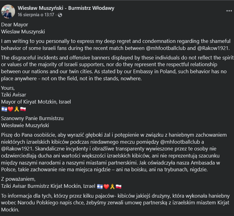 "Piszę do Pana osobiście, aby wyrazić mój głęboki żal oraz stanowcze potępienie haniebnego zachowania części izraelskich kibiców podczas niedawnego meczu pomiędzy Maccabi Haifa a Rakowem Częstochowa. Skandaliczne incydenty oraz obraźliwe transparenty wywieszone przez te osoby nie odzwierciedlają ducha ani wartości większości izraelskich kibiców, ani nie reprezentują pełnych szacunku relacji między naszymi narodami i naszymi miastami partnerskimi".