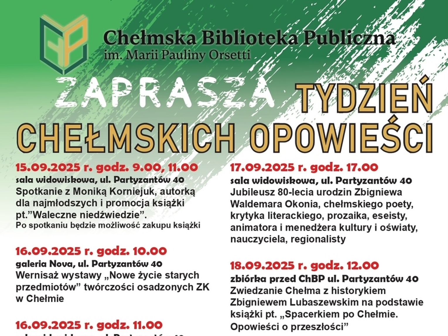 Tydzień rozpocznie się 15 września o godzinie 9:00 i 11:00 spotkaniem z autorką Moniką Korniejuk, która zaprezentuje najmłodszym swoją książkę pt. „Waleczne niedźwiedzie”. Kolejnego dnia, 16 września, program obejmuje dwa wydarzenia. O godzinie 10.00 odbędzie się wernisaż „Nowe życie starych przedmiotów”, prezentującej twórczość osadzonych z Zakładu Karnego w Chełmie. Godzinę później, o 11:00, publiczność będzie miała okazję spotkać się z Ewą Kassalą, autorką powieści historycznych, która promować będzie swoją książkę pt. „Czas korony”.
