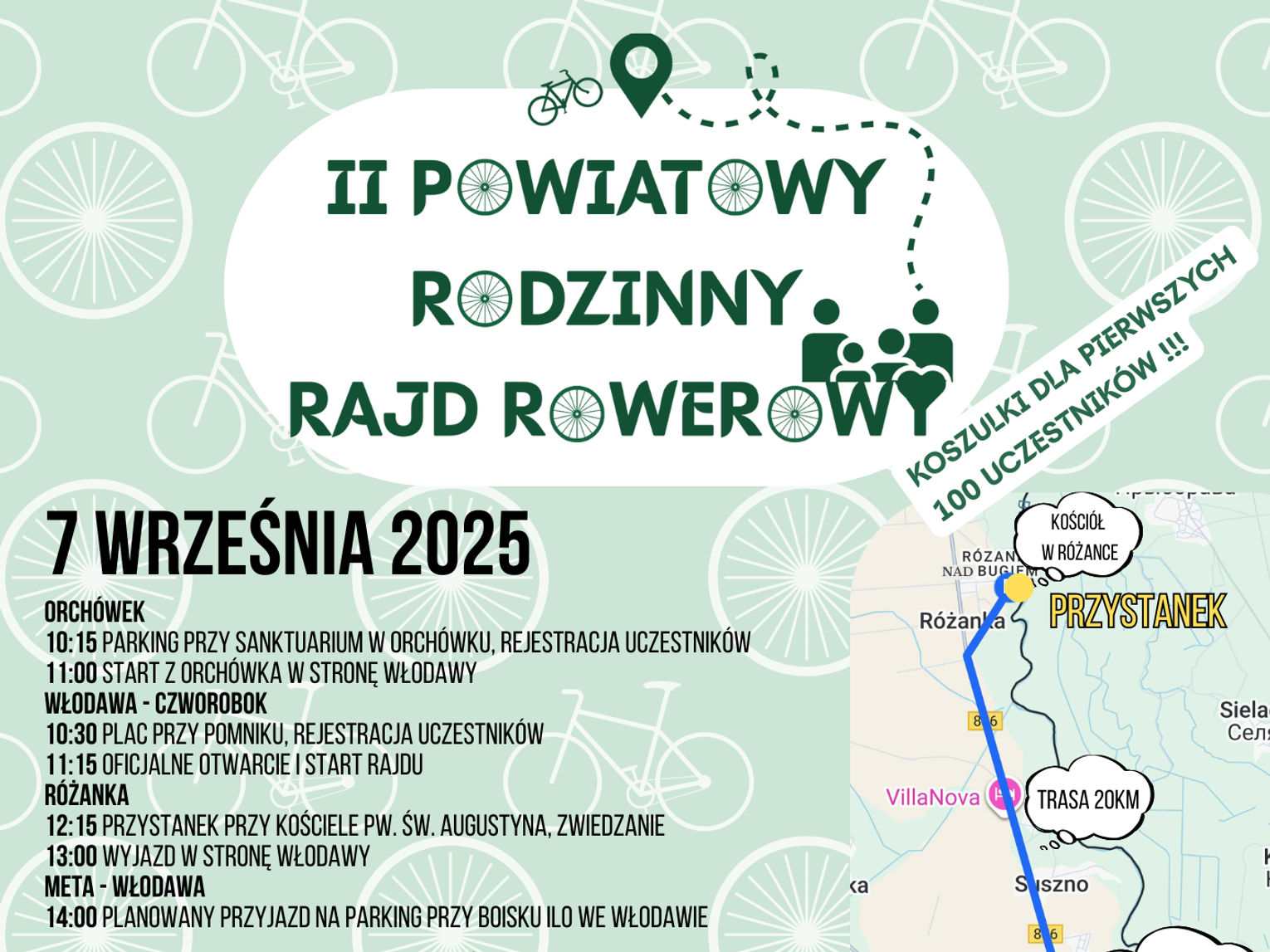 Główna część wydarzenia, rajd rowerowy, wyruszy z dwóch miejsc, z Orchówka i Włodawy. Zbiórka z rejestracją uczestników w pierwszym miejscu przy sanktuarium zaplanowana jest o godzinie 10:15, z kolei o 11:15 we Włodawie przy Czworoboku. Trasa o długości 20 kilometrów prowadzi przez tereny gminy Włodawa, obejmując przystanek w Różance, gdzie odbędzie się zwiedzanie z przewodnikiem.