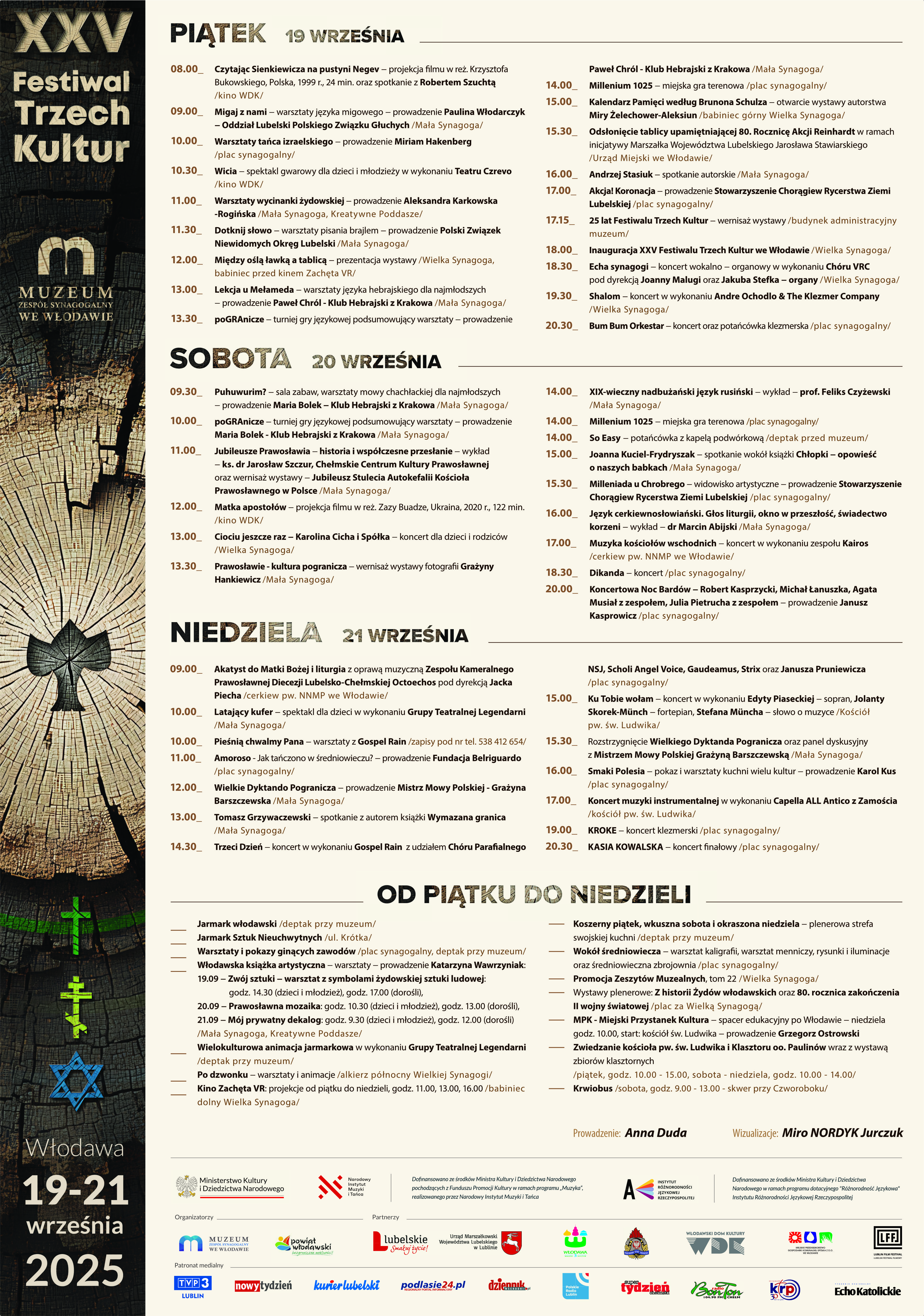 XXV jubileuszowa edycja Festiwalu Trzech Kultur odbędzie się w dniach 19-21 września. Wydarzenie, organizowane przez Muzeum Zespół Synagogalny we Włodawie, ma na celu łączenie przeszłości i teraźniejszości miasteczka, a także promowanie dialogu międzykulturowego. Wstęp na wszystkie punkty programu jest bezpłatny.