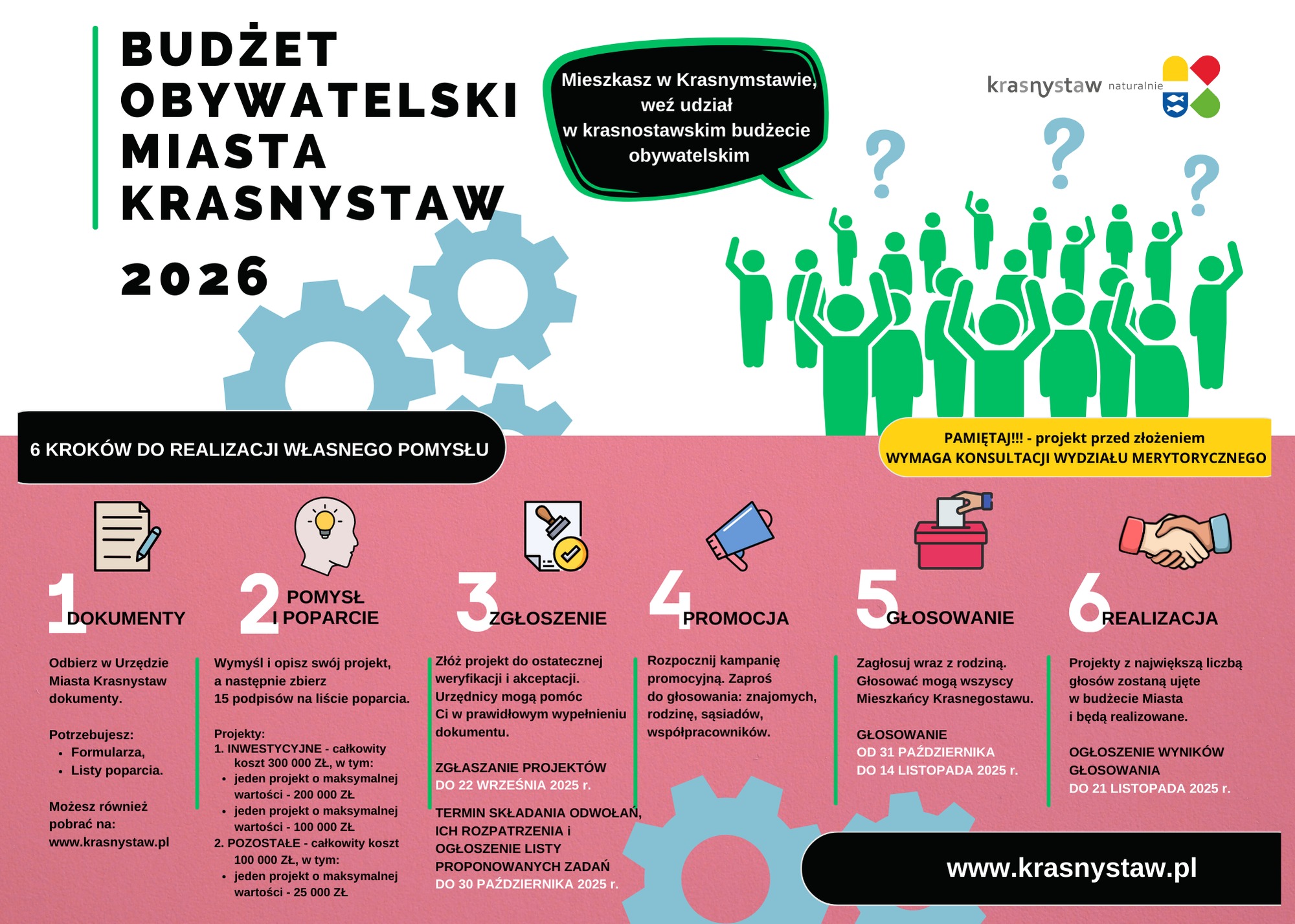 Aby zgłosić swój pomysł, potrzebne jest poparcie co najmniej 15 mieszkańców Krasnegostawu. Autorzy wniosków powinni także wcześniej skonsultować projekt z odpowiednimi komórkami organizacyjnymi urzędu miasta lub miejskimi jednostkami, aby prawidłowo oszacować koszty i sprawdzić wykonalność przedsięwzięcia.