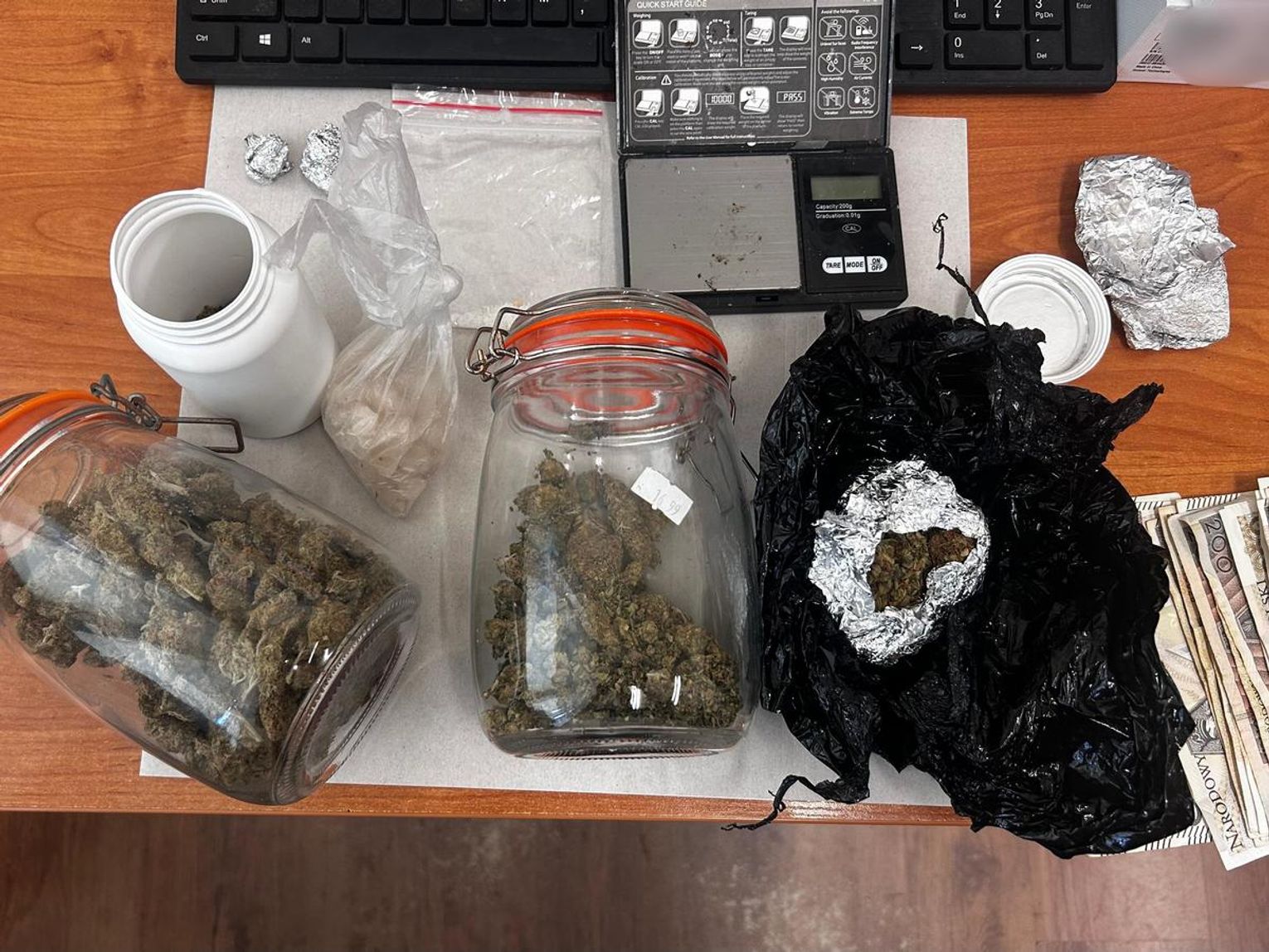 Wstępne badanie wykazało, że 26-latek posiadał blisko 200 gram marihuany oraz prawie 52 gramy mefedronu. Z przejętych przez mundurowych środków odurzających można było przygotować blisko 1200 porcji handlowych. Policjanci znaleźli też wagę służącą do porcjowania narkotyków oraz gotówkę.