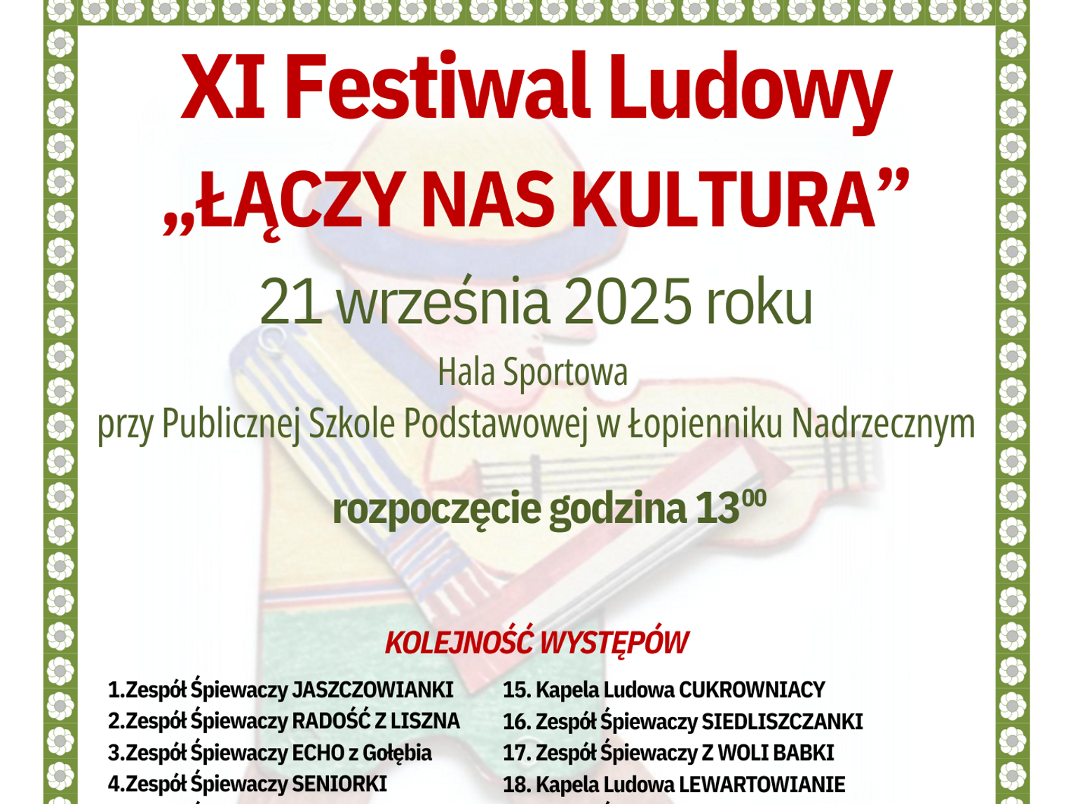 Festiwal rozpocznie się o godzinie 13:00 w Hali Sportowej przy Publicznej Szkole Podstawowej w Łopienniku Nadrzecznym. Na scenie zaprezentuje się szeroka gama artystów.