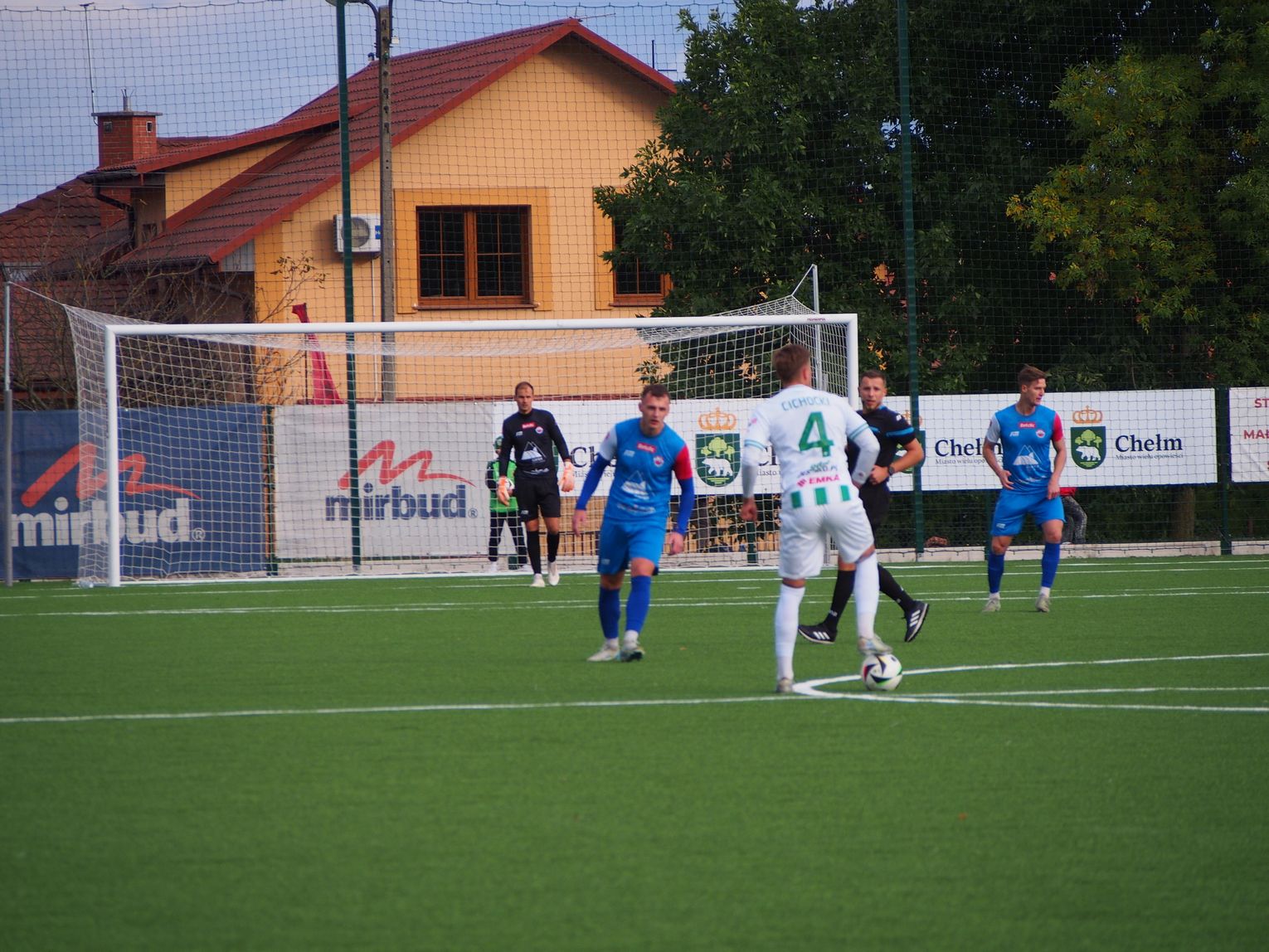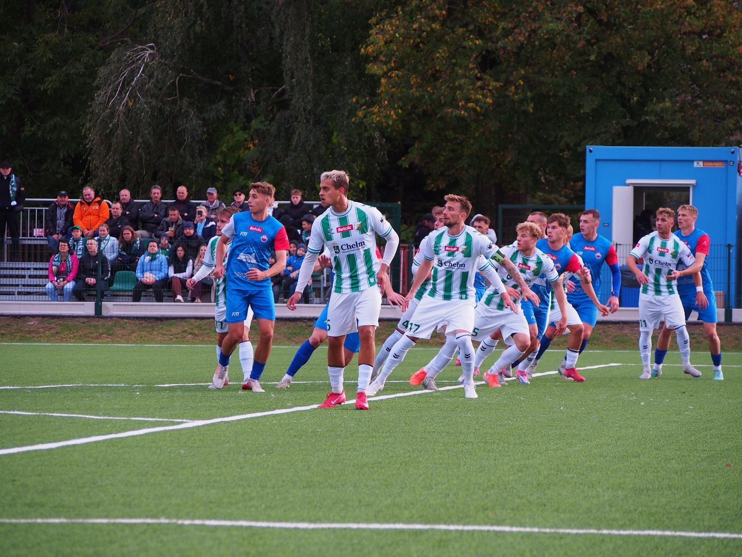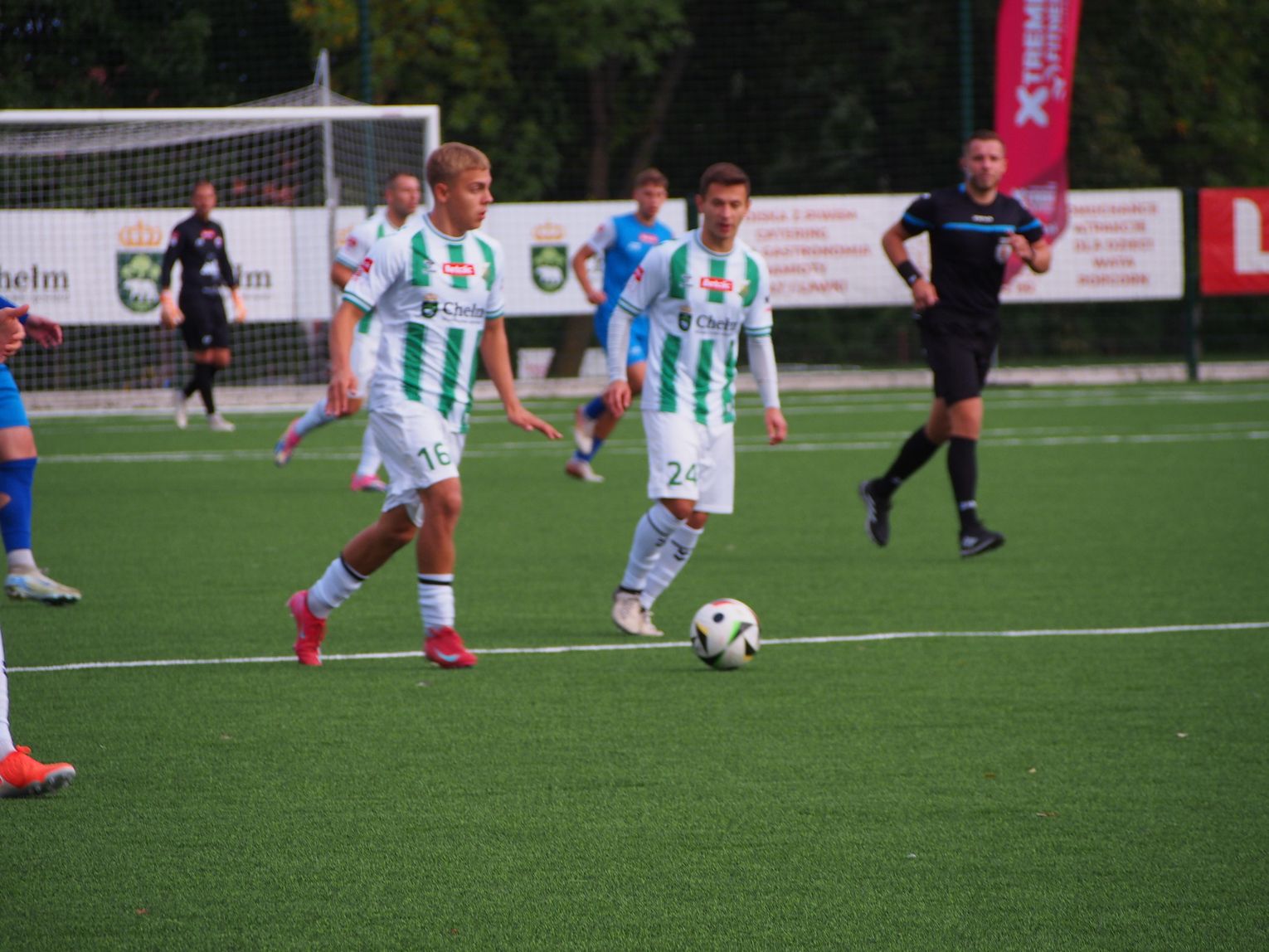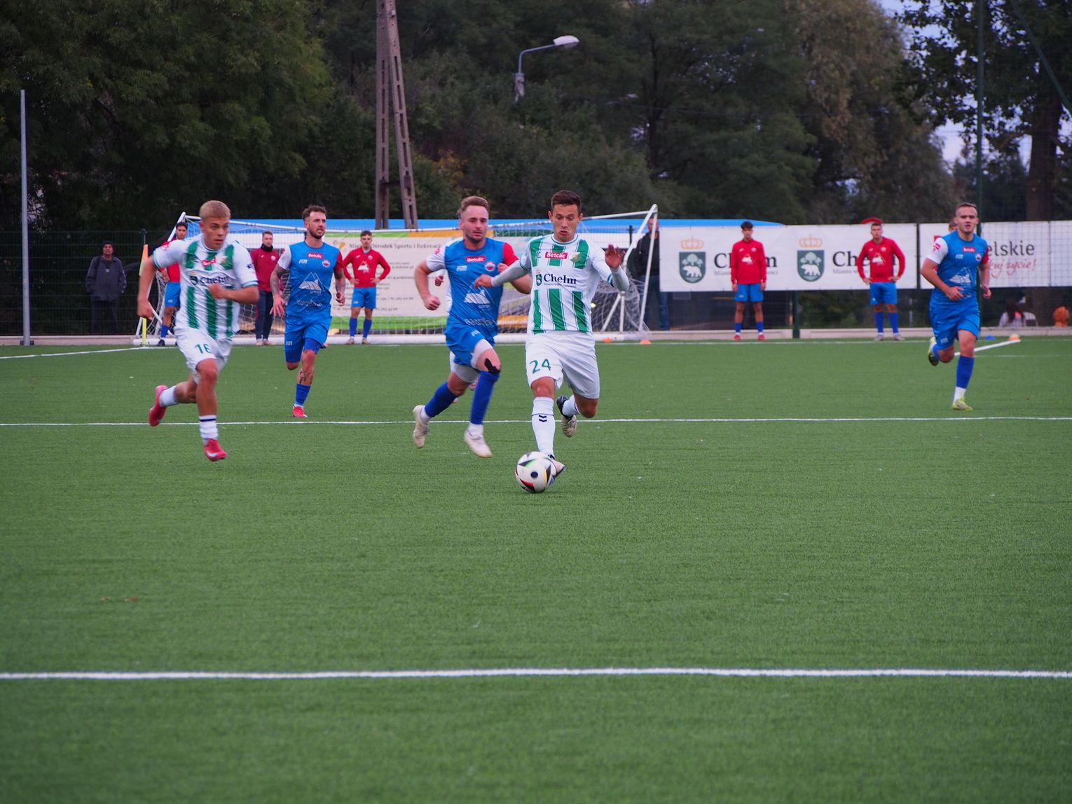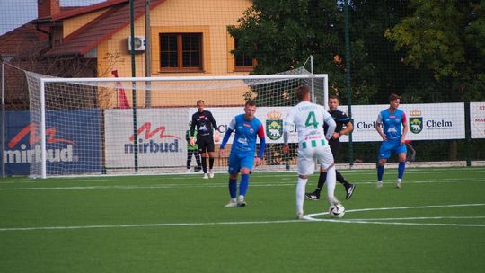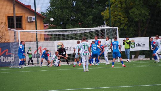 Mecz miał bardzo dynamiczny początek i gra toczyła się praktycznie na całym boisku. W 5. minucie doszło do nerwowej sytuacji, która „pachniała” karnym dla gospodarzy, jednak sędzia nie dopatrzył się faulu. Dwie minuty później walka pod polem bramkowym gości przyniosła oczekiwany skutek dla Chełmianki, kiedy piłkę za plecy Artsioma Hemalki posłał Krystian Derkacz, dając swojej drużynie prowadzenie. Ten gol widocznie podciął skrzydła zespołowi Sparty, ponieważ dał się on zepchnąć do obrony i szukał swoich okazji w kontratakach, kilka razy niemal docierając do bramki biało-zielonych. Tam jednak czekali na nich czujni defensorzy oraz skupiony Adam Wilk, którzy skutecznie powstrzymywali przyjezdnych od kontaktowego trafienia. Ostatnie minuty pierwszej połowy minęły praktycznie pod bramką Sparty, której sprzyjało szczęście, bo piłka omijała ich siatkę, a gospodarzom brakowało dokładności w strzałach. W końcówce goście mieli jeszcze szansę na wyrównanie, ale rzut wolny obronił goalkeeper Chełmianki.