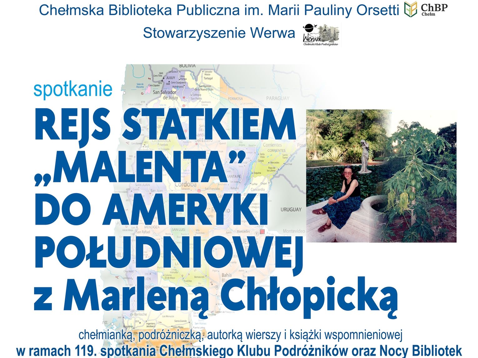 Głównym wydarzeniem tego dnia będzie 119. spotkanie Chełmskiego Klubu Podróżników, współorganizowane ze Stowarzyszeniem WeRwA. Marlena Chłopicka zabierze uczestników w „Rejs statkiem „Malenta” do Ameryki Południowej”. Prelekcja odbędzie się w sali widowiskowej o godzinie 17.00 przy ul. Partyzantów 40. Będzie to również okazja do promocji książki autorki, zatytułowanej „Malenta”.