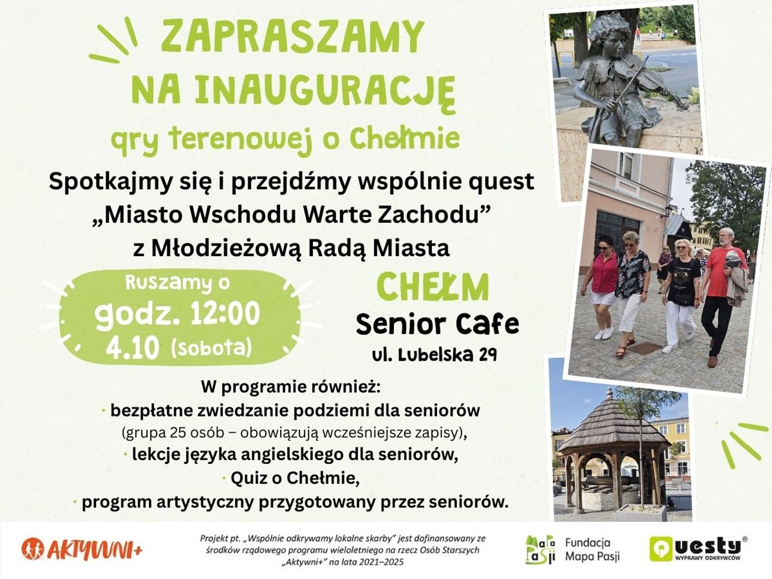 Spotkanie inaugurujące quest rozpocznie się przy Senior Cafe, ul. Lubelska 29, w miejscu wyjścia z Podziemi Kredowych. Quest "Miasto Wschodu Warte Zachodu" to forma aktywnego zwiedzania, polegająca na poszukiwaniu wskazówek i rozwiązywaniu zagadek i jednocześnie przybliżają uczestnikom historię oraz ciekawostki Chełma.