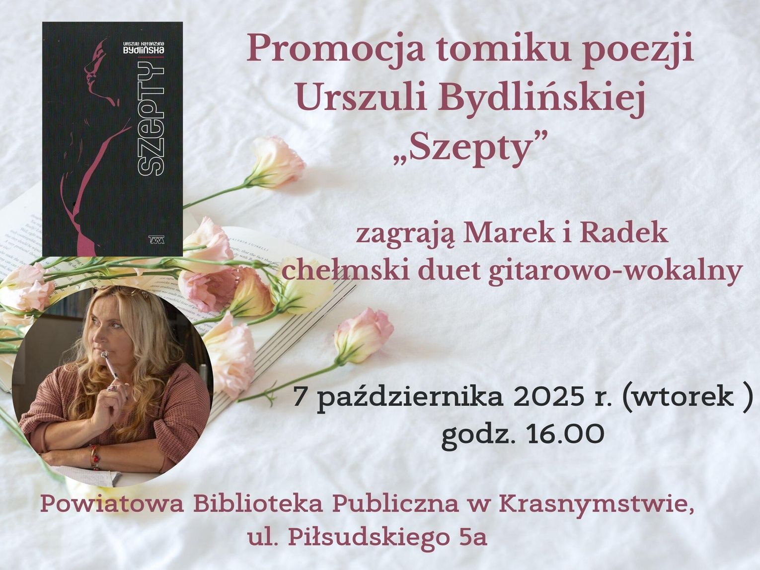 Podczas wydarzenia uczestnicy będą mogli wysłuchać wierszy autorki, które wypełnią klimat spotkania subtelną, refleksyjną liryką. Nastrojowi towarzyszyć będzie mini recital duetu gitarowo-wokalnego „Marek i Radek” z Chełma, dodając artystycznej całości wyjątkowej oprawy muzycznej.