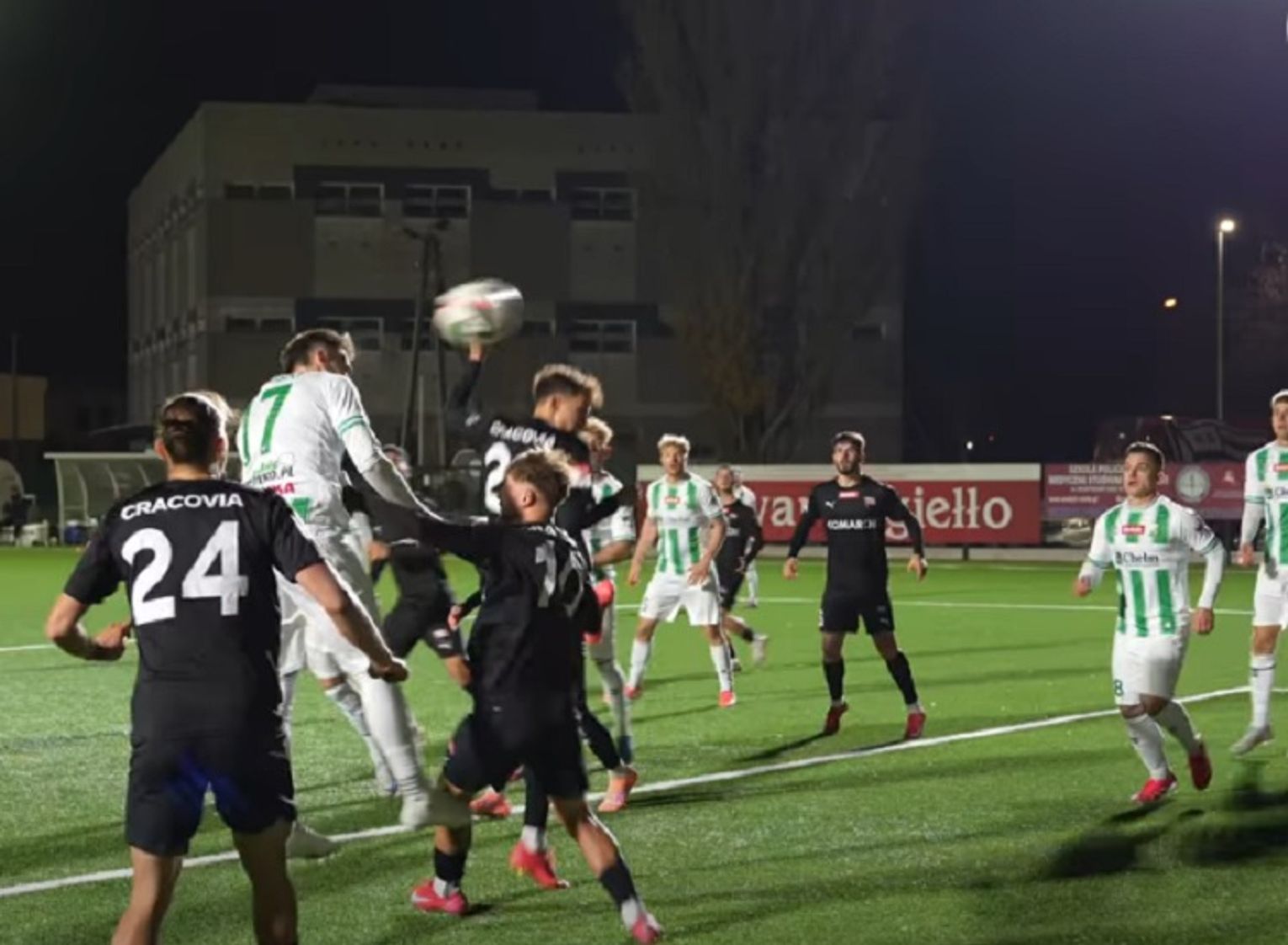 Początek meczu zwiastował, że będzie to zacięte starcie o punkty i rzeczywiście takie było. Obie strony szybko zaczęły stwarzać sobie okazję do wyjścia na prowadzenie, dla gospodarzy upatrywał jej Szymon Grączewski, z kontrą poszli po tym goście, ale strzał Ramila Mustafeava obronił Adam Wilk. Tę stratę dla przyjezdnych próbował odrobić Kacper Jodłowski, a chwilę później pojawiła się szansa na bramkę dla biało-zielonych, jednak Bartłomiejowi Korbecki udało się trafić jedynie w bramkarza rywali. Zmiana na tablicy wyników pojawiła się mimo wszystko szybko, bo już w ósmej minucie. Zagotowało się w polu karnym Cracovii, piłkę z rzutu rożnego przechwycił głową Radosław Adamski, ta odbiła się od poprzeczki, ale prosto pod nogę Piotra Cichockiego, który dopełnił dzieła golem. Do przerwy walka o kolejne bramki nie zwolniła tempa, jednak to gospodarze schodzili na przerwę z prowadzeniem.
