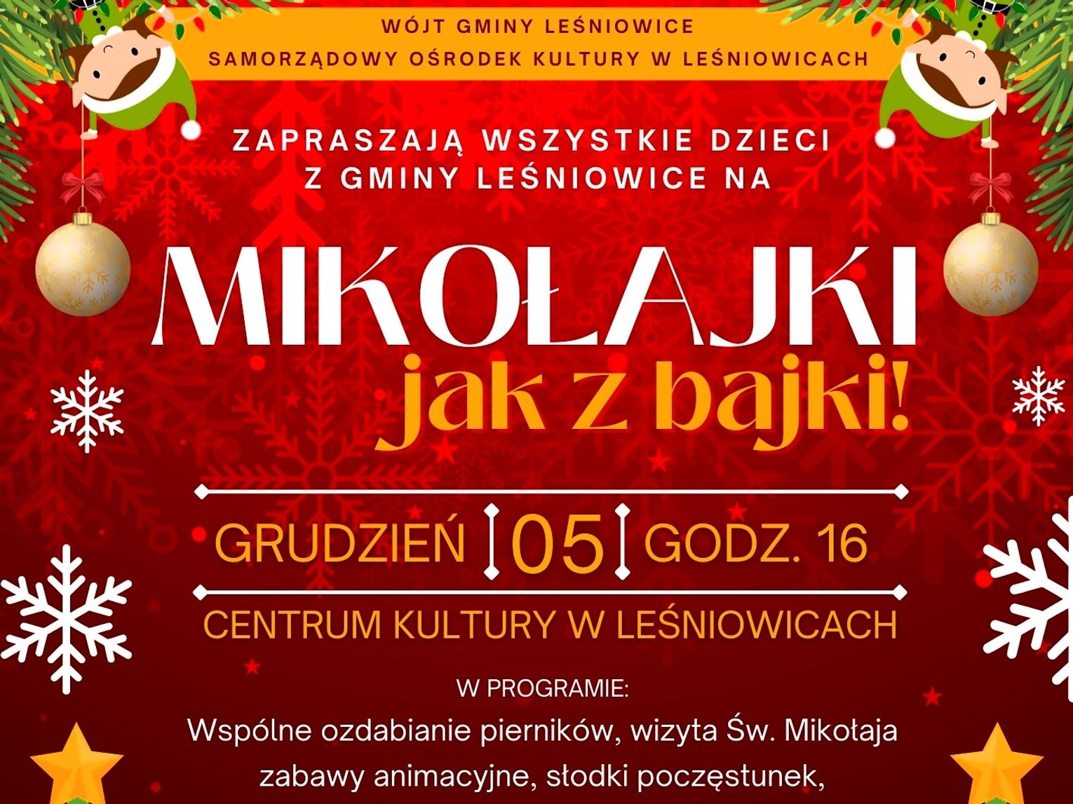Wydarzenie odbędzie się 5 grudnia o godzinie 16:00 w Centrum Kultury w Leśniowicach. Program został przygotowany z myślą o zapewnieniu rozrywki i stworzeniu magicznej atmosfery. Wśród zaplanowanych punktów programu znalazły się takie atrakcje jak: wspólne ozdabianie pierników, wizyta Świętego Mikołaja, zabawy animacyjne oraz słodki poczęstunek.
