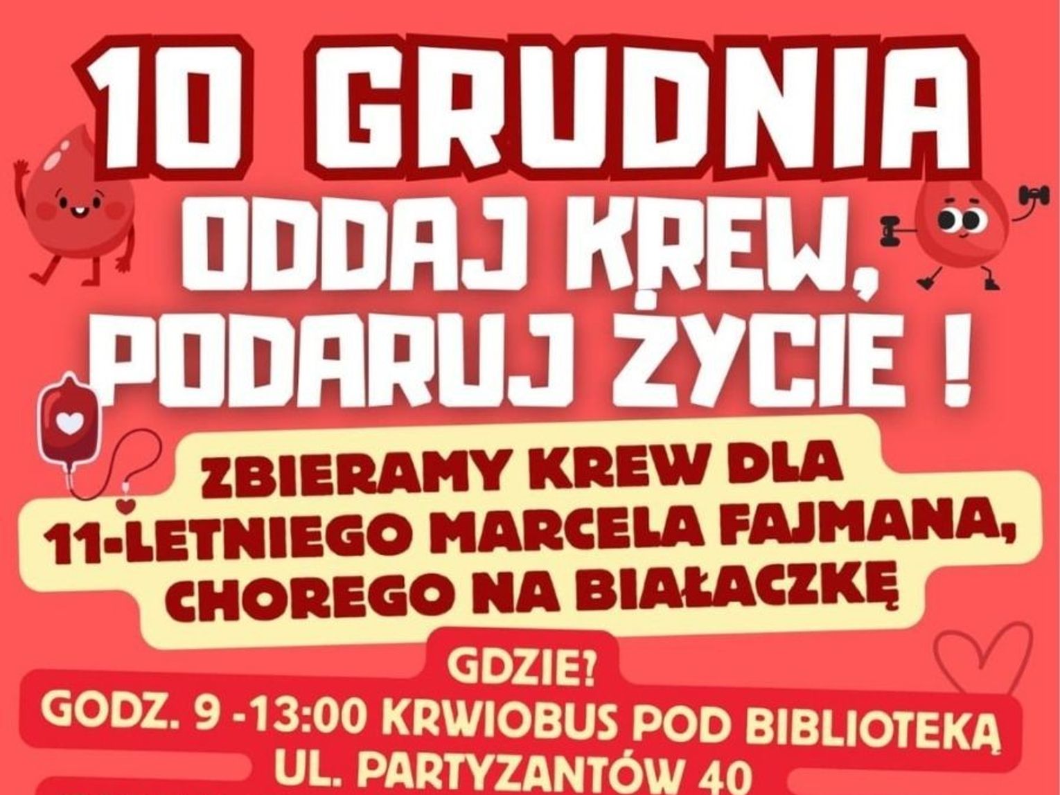 Zbiórka krwi odbędzie się 10 grudnia w godzinach 9:00–13:00. Krwiobus stanie przy Chełmskiej Bibliotece Publicznej im. Marii Pauliny Orsetti. Tego samego dnia krew będzie można oddać również w terenowym oddziale Regionalnego Centrum Krwiodawstwa i Krwiolecznictwa przy ul. Szpitalnej – tam rejestracja potrwa od 7:00 do 12:00.