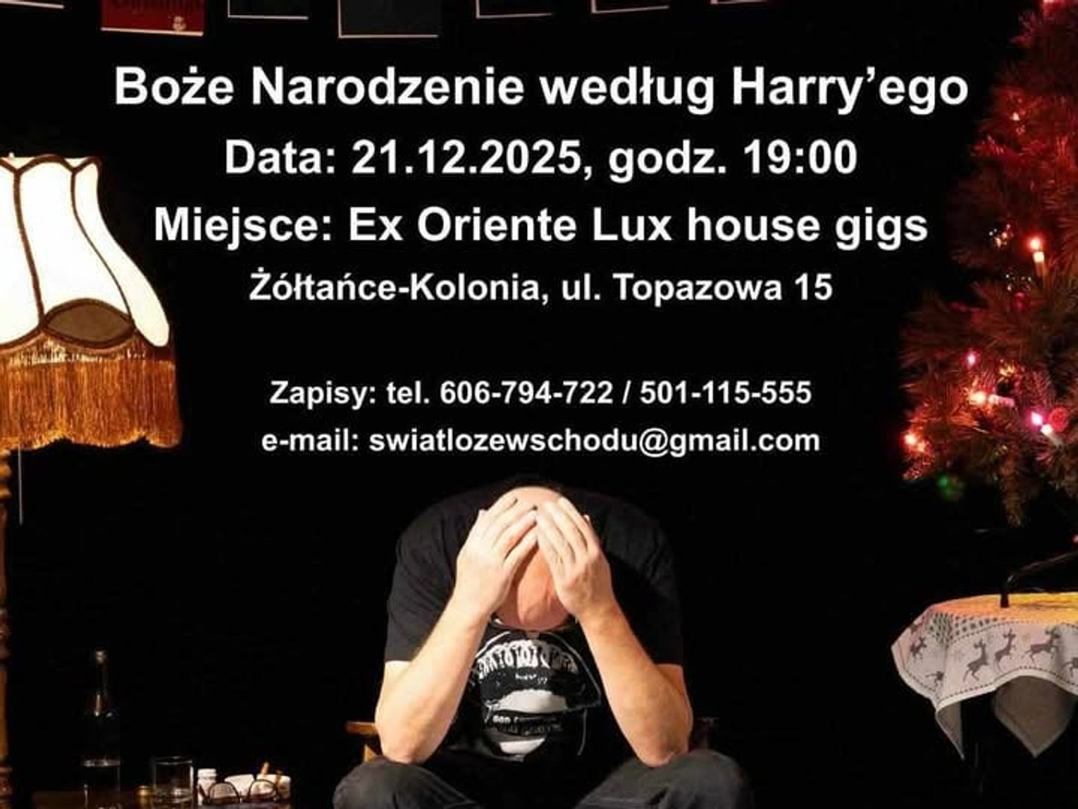 Obowiązuje limit 30 osób, a udział w wydarzeniu jest możliwy wyłącznie po wcześniejszym zapisie. Rejestracja prowadzona jest drogą mailową ([email protected]) lub telefoniczną (606-7940722 lub 501-115-555). Wstęp odbywa się na zasadzie "kapelusza" (dobrowolnej opłaty), a środki zebrane w ten sposób w tym przypadku zostaną przeznaczone na cele charytatywne. Organizatorzy, Ex Oriente Lux house gigs, zapraszają do wspólnego spędzenia czasu po spektaklu.