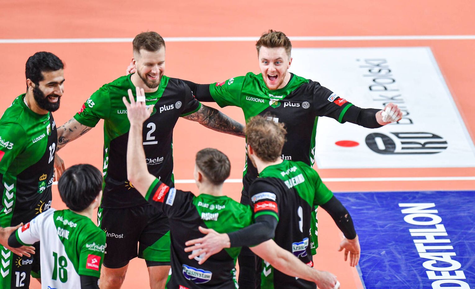 Pierwsze dwa punkty zdobyli gospodarze meczu, zaś oczko dla biało-zielonych wpadło po tym, jak Konrad Stajer zaserwował piłkę w siatkę. Chwilę później taki sam prezent gościom sprawił Kamil Rychlicki, ale błędy zdarzały się również po stronie zespołu prowadzonego przez Krzysztofa Andrzejewskiego. Biało-zieloni ścigali wynik póki w pole serwisowe nie wszedł Paweł Rusin i dwoma asami pod rząd doprowadził do remisu 9:9. Za chwilę dziesiąty punkt zapewniający prowadzenie dołożył Amirhossein Esfandiar i role na boisku się odwróciły, bo to ZAKSA goniła rywali. Punktem zwrotnym partii były dwa oczka przewagi InPostu przy stanie 18:16, osiągniętym po ofensywnym bloku, a kilka minut później drużyna z Chełma miała dwie piłki setowe, kiedy na tablicy widniał wynik 24:21. Najpierw jednak Jakub Turski popełnił błąd w zagrywce, a zaraz później niedokładną kiwką oczko oddał gospodarzom Jay Blankenau, zaś do remisu doprowadził Rychlicki obijając blok przeciwników. Zaczęła się walka o przełamanie i trwała przez kilkanaście minut, finalnie kończąc się wygraną seta przez podopiecznych trenera Andrea Gianiego przy stanie 34:32.