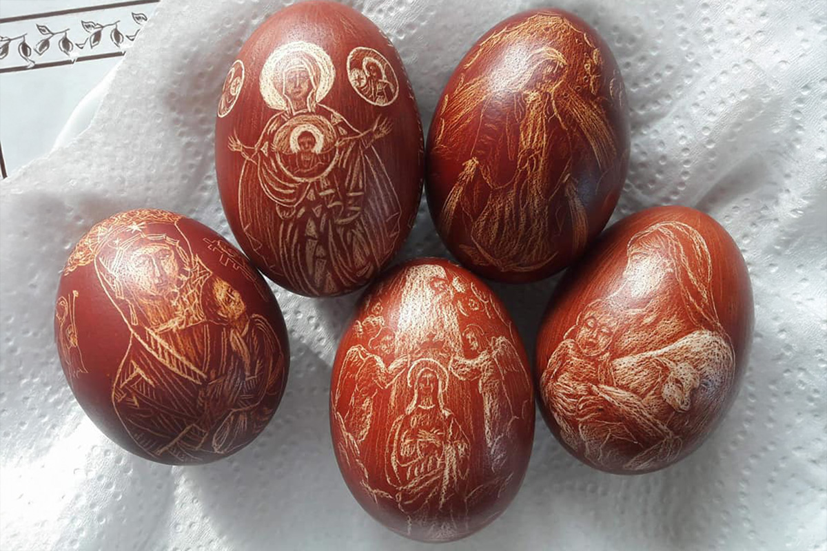 Charakterystyczna technika drapania polega na ręcznym wydobywaniu wzoru z wcześniej zabarwionej skorupki jajka. Najczęściej barwi się je w naturalnych wywarach, głównie z łupin cebuli, dzięki czemu uzyskują głębokie odcienie czerwieni, brązu i wiśni. Na tak przygotowanej powierzchni twórcy wydrapują cienkie, płynne linie, tworząc motywy geometryczne, solarne, roślinne i religijne. Każda kraska jest niepowtarzalna, a zestawienie jasnych ornamentów z ciemnym tłem nadaje jej wyjątkowy, niemal malarski charakter. Do wykonania krasek używa się prostych, lecz bardzo ostrych narzędzi. Cały proces odbywa się ręcznie, od starannego doboru jaj, przez barwienie, aż po precyzyjne drapanie wzoru. Praca wymaga skupienia i doświadczenia, ponieważ jeden nieostrożny ruch może zniszczyć efekt wielogodzinnych przygotowań.