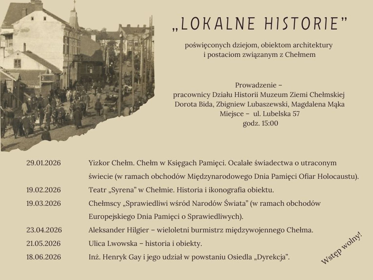 Program nadchodzącej edycji obejmuje sześć terminów, podczas których pracownicy Działu Historii, Dorota Bida, Zbigniew Lubaszewski oraz Magdalena Mąka, zaprezentują różne aspekty przeszłości miasta. Wykłady zaplanowano na czwartki, na godzinę 15:00.