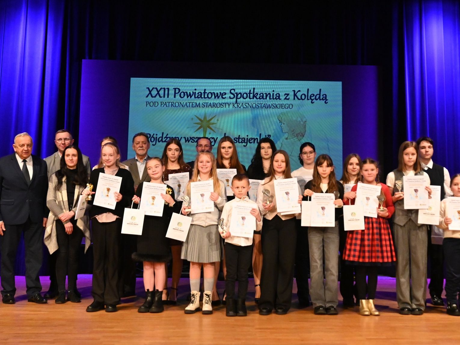 Zwieńczeniem wydarzenia było uroczyste wręczenie nagród, dyplomów oraz pamiątkowych statuetek. Laureatom gratulacje złożył starosta krasnostawski Janusz Szpak, podkreślając znaczenie konkursu dla promocji kultury i integracji lokalnej społeczności. W swoim wystąpieniu pogratulował uczestnikom odwagi scenicznej i zaangażowania, a nauczycielom oraz opiekunom artystycznym podziękował za trud włożony w przygotowanie występów.
