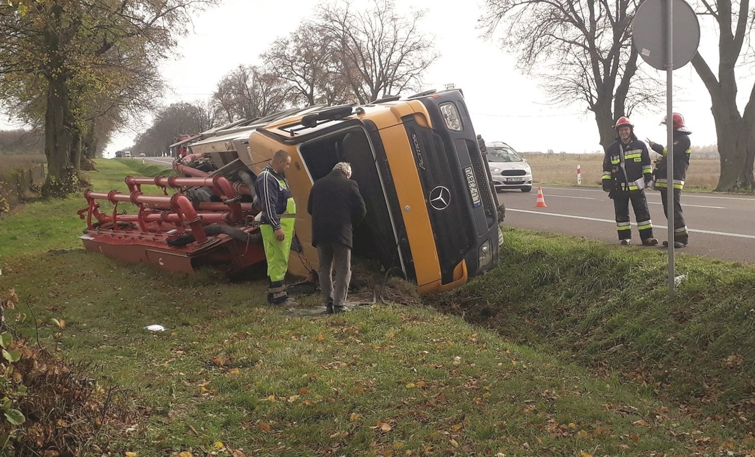 Podczas wyprzedzania kierowca scanii zahaczył o lusterko ciężarowego mercedesa. W efekcie kierujący drugim samochodem ratował się ucieczką na pobocze, a potem w rowie przewrócił się na prawy bok.