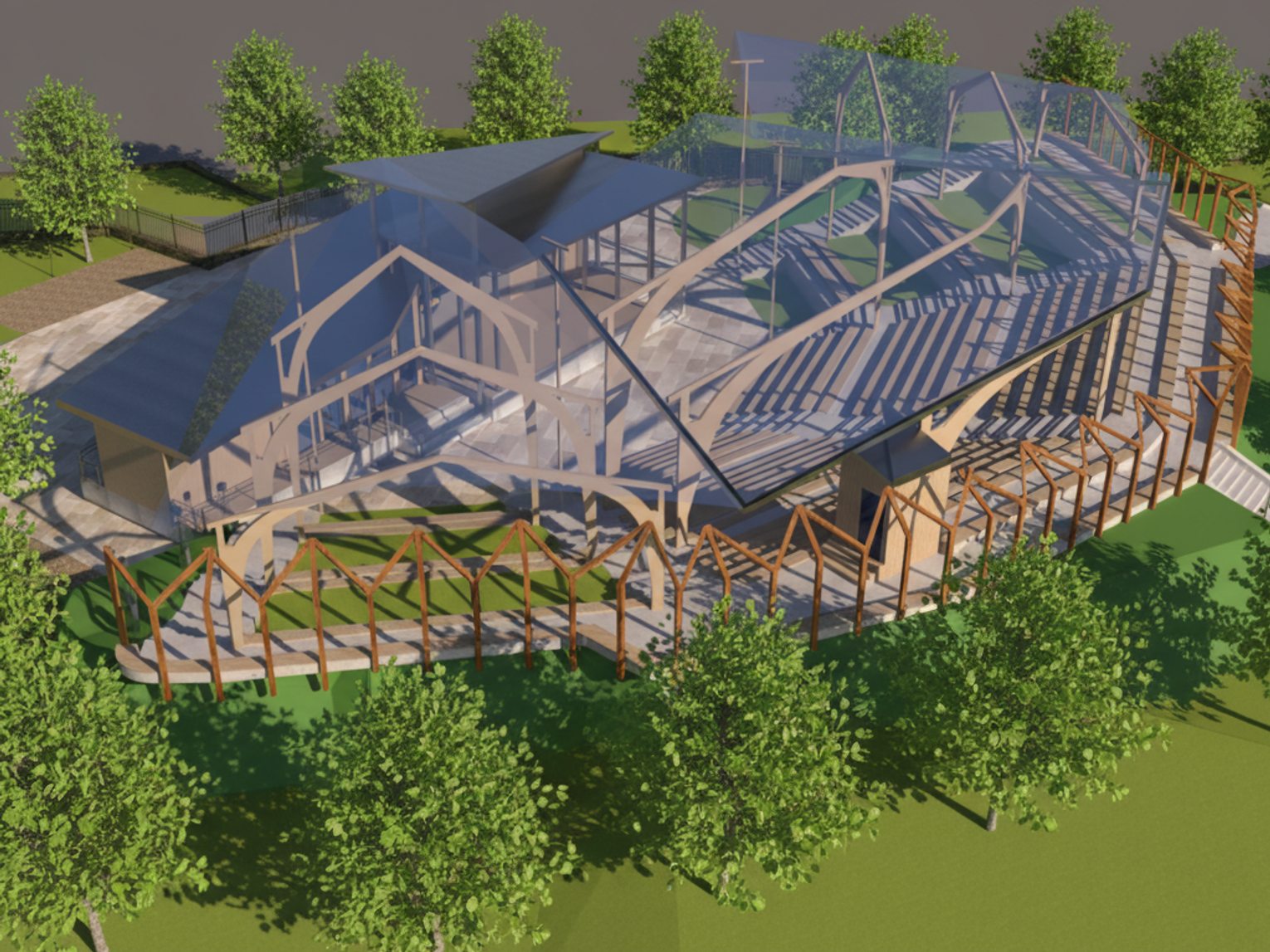 Projekt zakłada powstanie pełnowymiarowej sceny z niezbędnym zapleczem technicznym, w tym garderobami dla artystów, zapleczem sanitarnym oraz częścią kawiarnianą. Cały kompleks ma zostać zaprojektowany jako spójna i funkcjonalna przestrzeń, umożliwiająca sprawną organizację wydarzeń kulturalnych, koncertów i imprez plenerowych o różnej skali.