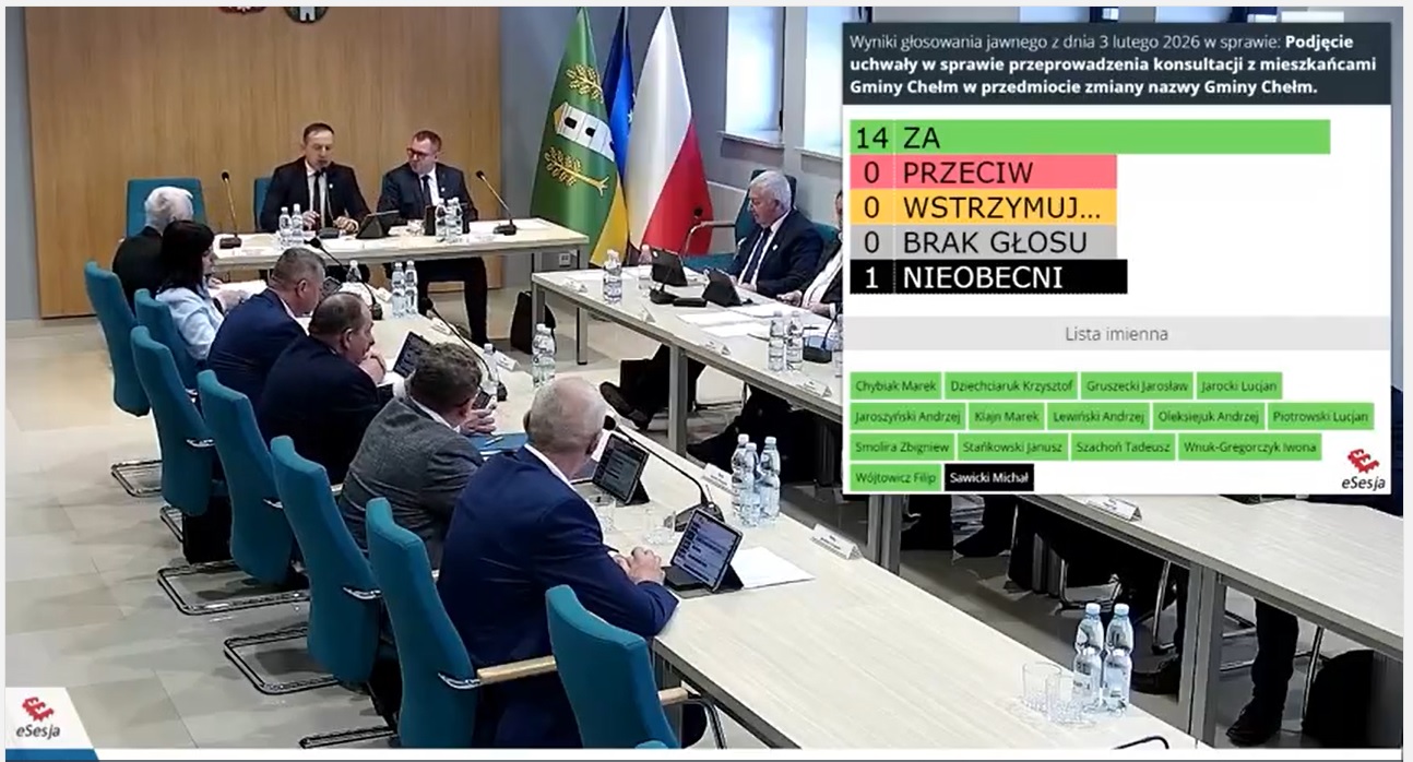 Rada jednogłośnie, 14 głosami „za”, podjęła uchwałę o przeprowadzeniu konsultacji społecznych w sprawie zmiany nazwy gminy. Konsultacje mają się odbyć w terminie od 7 do 16 marca 2026 roku, w formie ankiet papierowych i elektronicznych.