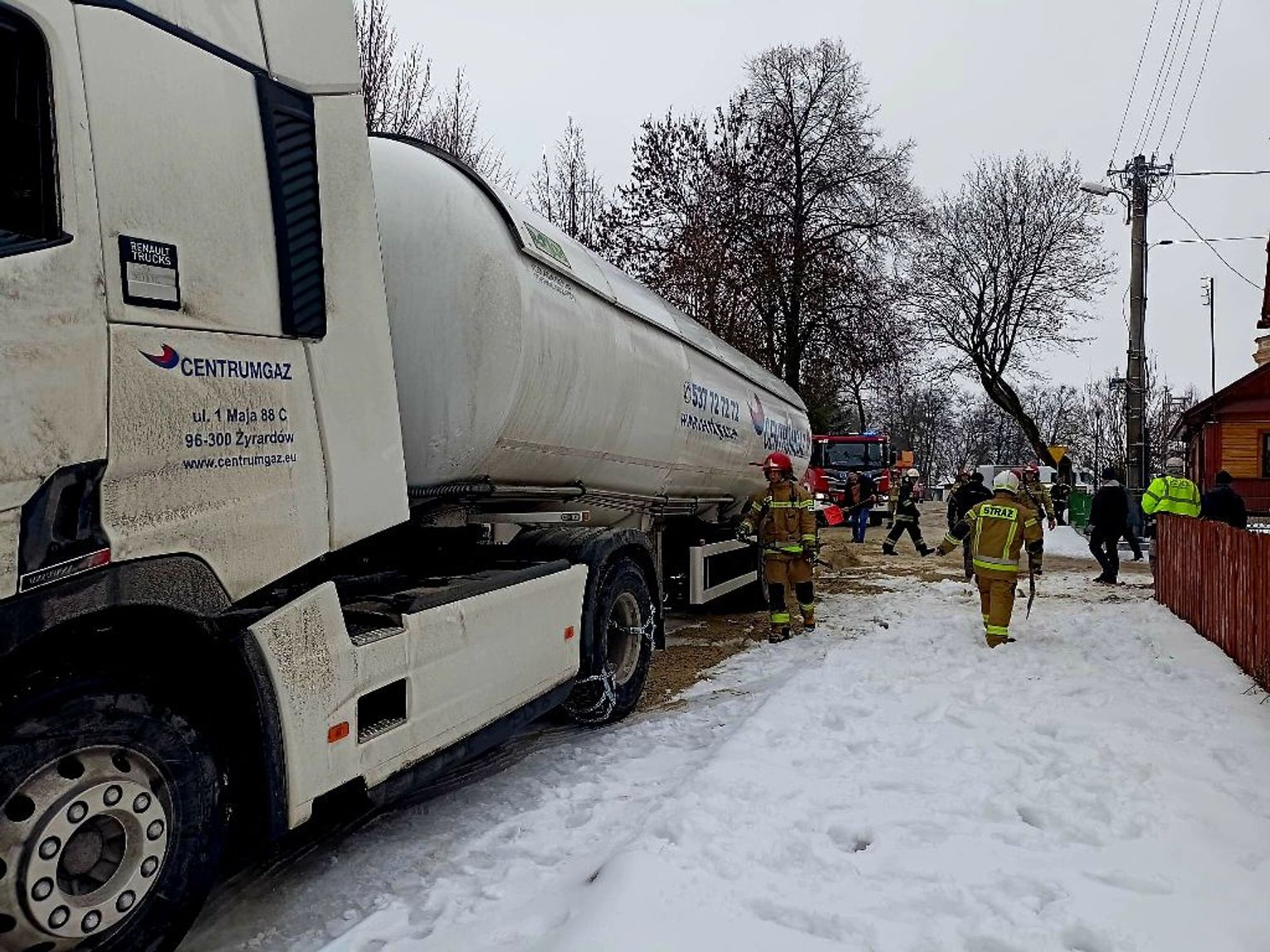 Jak podaje Komenda Miejska PSP w Białej Podlaskiej, w Kodniu, 12 lutego, cysterna z gazem (około 40m3 gazu) wykonując skręt w lewo, zsunęła się na oblodzonej nawierzchni na ogrodzenie działki i blokowała przejazd w obu kierunkach.