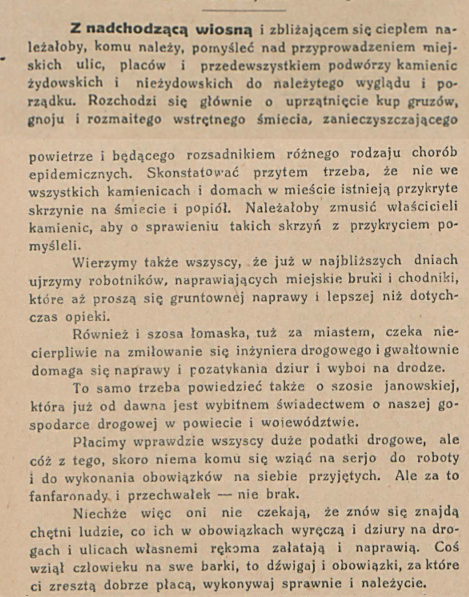 W marcowym numerze „Podlasiaka” z 1924 r. doktor M. Skorupski, piastujący urząd lekarza powiatowego, wystosował do mieszkańców Białej Podlaskiej apel, który dziś czyta się niemal jak manifest wojenny przeciwko brudowi. Jego diagnoza stanu sanitarnego miasta była bezlitosna. Zauważył on trafnie, że nadchodząca wiosna, choć wyczekiwana, niesie ze sobą śmiertelne zagrożenie. „Grube warstwy śniegu i lodu, przesiąknięte brudem i gnojem”, zaczynają topnieć, a ocieplające się powietrze „wchłaniać pocznie opary i wyziewy zabrudzonych domostw i ulic”. W tej dusznej atmosferze, zdaniem doktora, lęgną się „miljardy mikrobów i bakcyli przeróżnych chorób”, gotowych uderzyć w nieświadomych mieszkańców.