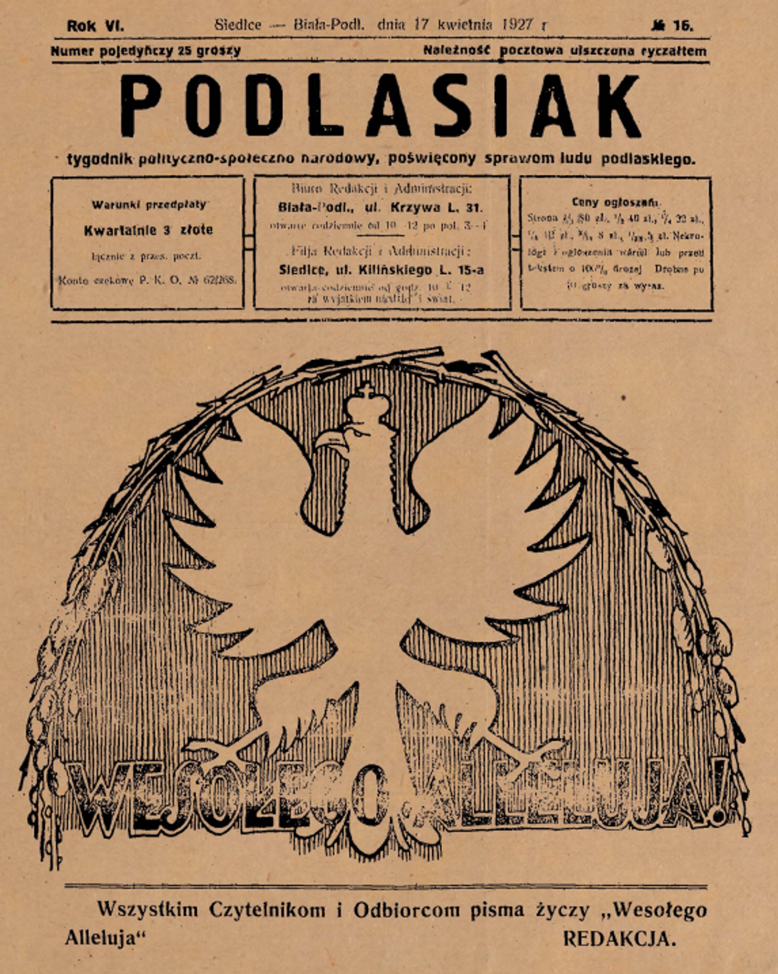 W świątecznym numerze z 20 kwietnia 1924 r., który trafił do rąk czytelników w samym sercu wielkanocnej radości, „Podlasiak” opublikował płomienne orędzie posła na Sejm, Stefana Łobacza. Parlamentarzysta, nawiązując do słów pieśni kościelnej „Wesoły nam dzień dziś nastał”, dokonał porównania religijnej tajemnicy do losów młodego państwa. Przypominał on z mocą, że z dniem zmartwychwstania Chrystusa nadeszło także „zmartwychwstanie naszej Ojczyzny”.