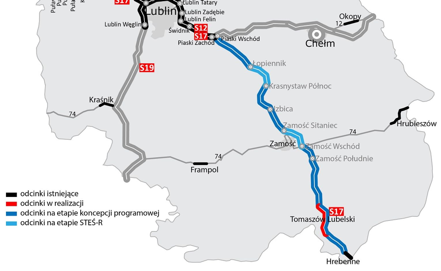Przetarg na trasę o łącznej długości ok. 120 km podzielony jest na trzy części. Pierwsza dotyczy trzech odcinków realizacyjnych o łącznej długości ok. 44 km: węzeł Piaski Wschód - Łopiennik (ok. 15,9 km), węzeł Krasnystaw Północ - Izbica (ok. 17,8 km) oraz węzeł Izbica - Zamość Sitaniec (ok. 10,3 km).