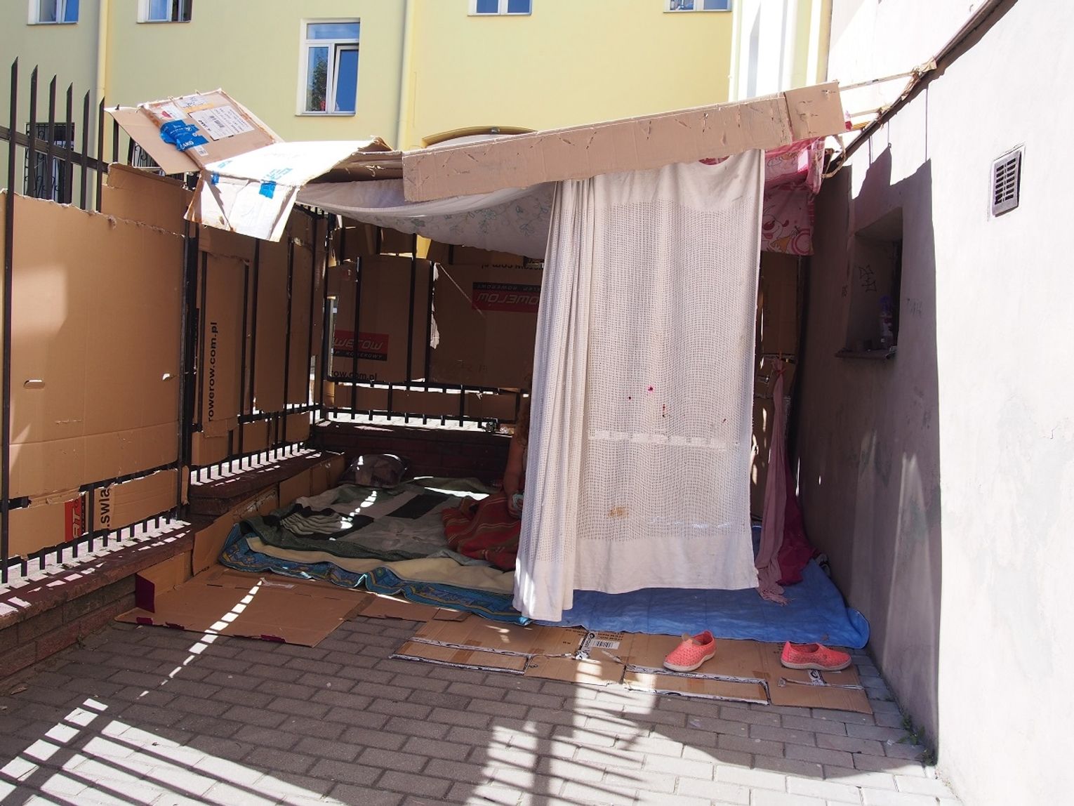 Kartonowy domek funkcjonował niecały jeden dzień. W kilka godzin później parasolki, poduszki, koce i zasłonki pojawiły się po drugiej stronie podwórza, tuż przy schodach.