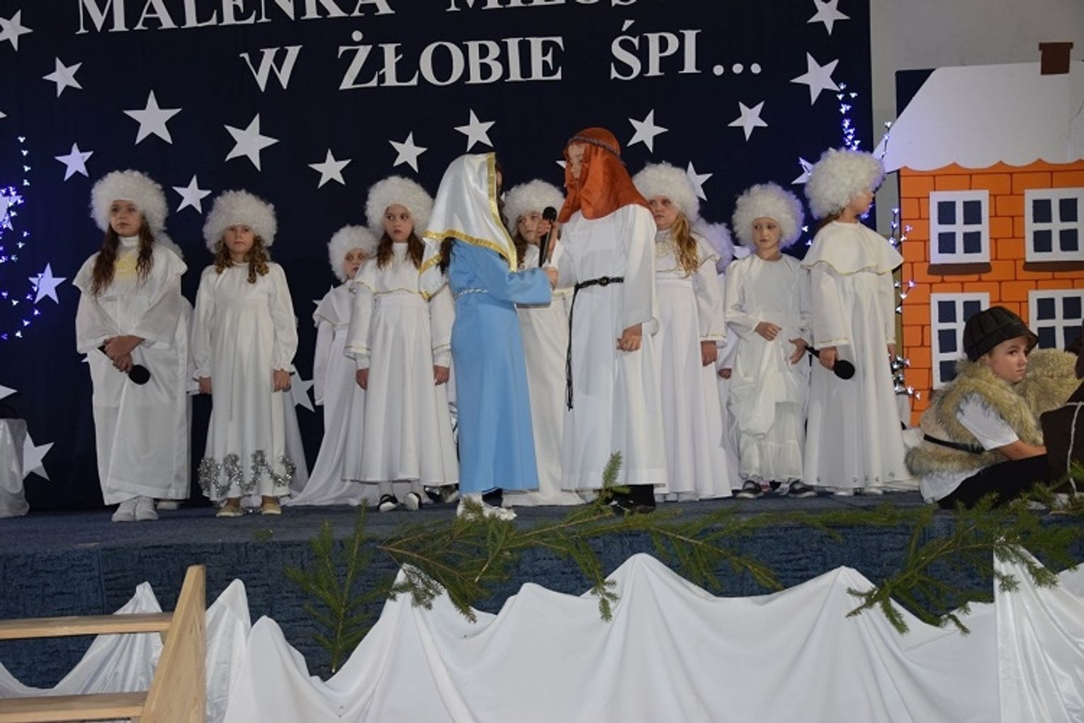 Spotkanie uświetnił występ uczniów klasy I, IIb oraz IIIa, którzy pod kierunkiem Agaty Skibińskiej i Barbary Demczuk Popielnickiej przygotowali jasełka zatytułowane „Maleńka miłość w żłobie śpi...”. Uczniowie klas II – VI dali koncert kolęd przygotowany przez Renatę Górkę. Wszystko to odbywało się po raz pierwszy na nowej scenie, która powstała dzięki hojności Ewy i Artura Stafińskich oraz wszystkich rodziców uczniów naszej szkoły.