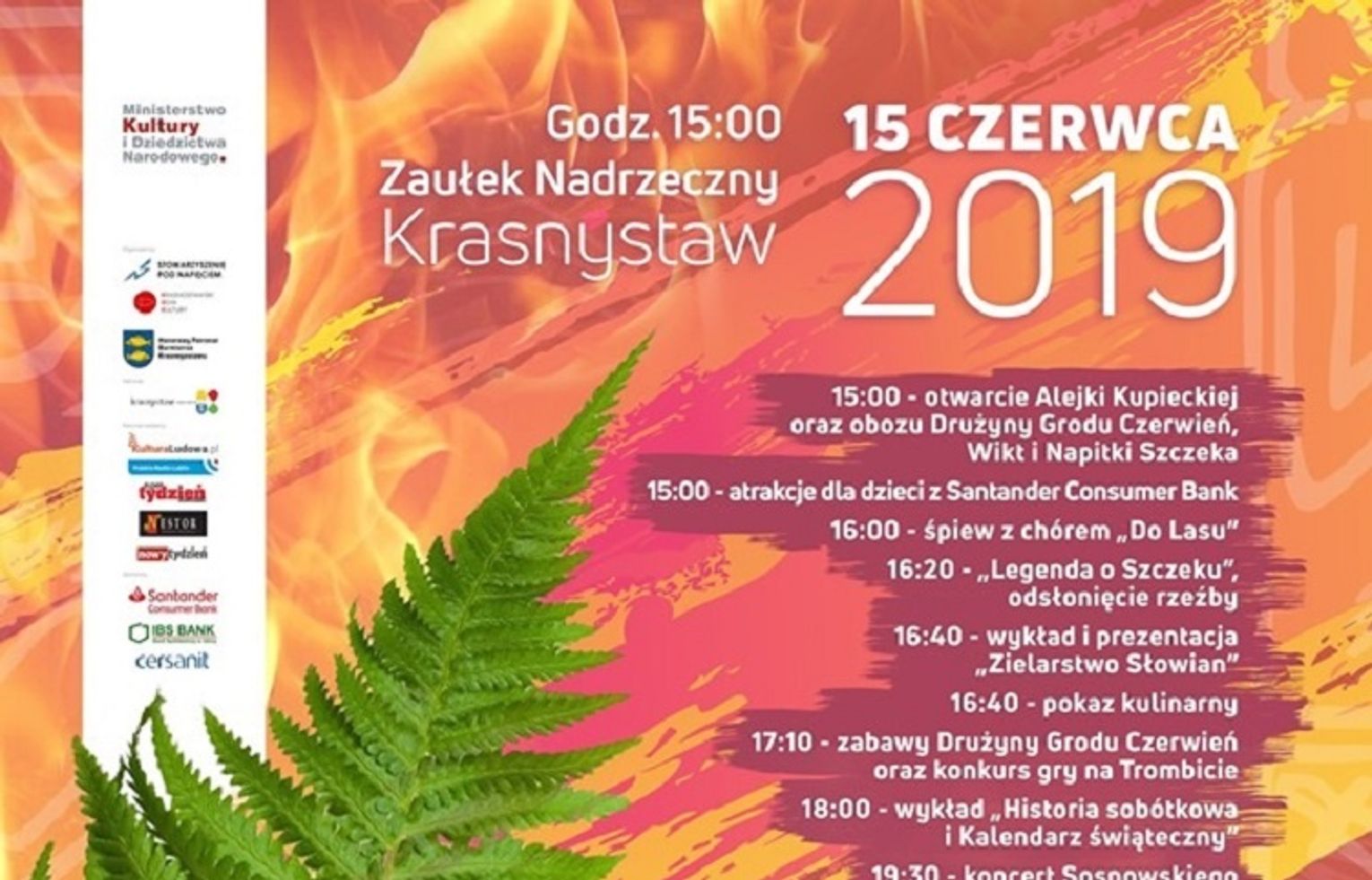 Jak co roku w taką noc nad wodą zapłoną ogniska. Będzie też puszczanie wianków i szukanie kwiatu paproci. W programie również fireshow, konkursy, a także degustacja potraw przyrządzonych na podstawie starodawnych receptur wprost od Szeptuchy. Swoje stanowiska będą mieli także twórcy ludowi, a podczas imprezy prowadzone będą warsztaty plastyczne, teatralne, wokalne, rzeźbiarskie i kulinarne.
