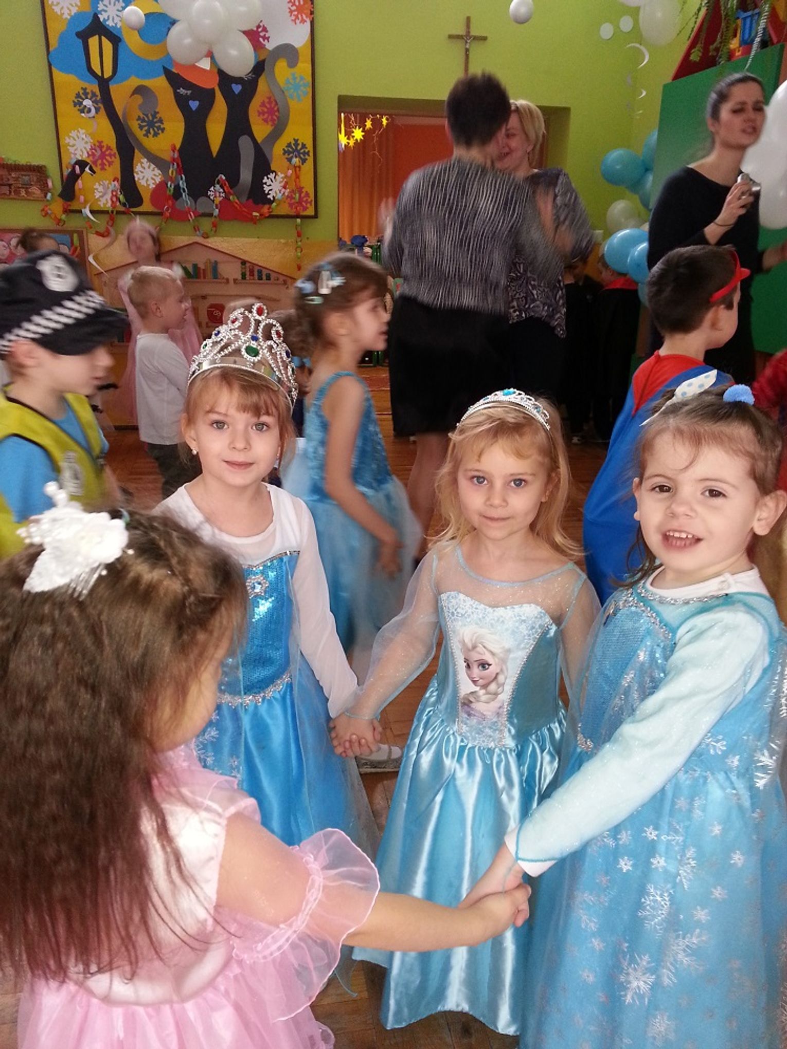 W tym dniu już od samego rana do przedszkola schodziły się ważne osobistości; księżniczki, „Elzy”, piraci, Batmani, policjanci i inne bajkowe postacie. Bal karnawałowy rozpoczęła Pani dyrektor w zaczarowanej Sali „Kraina Lodu”. Wszyscy uczestnicy zostali zaproszeni do przyjaznego kręgu, po czym nastąpiło uroczyste przywitanie przez „Elzę”. Po wielkiej prezentacji strojów rozpoczęły się tańce – przy rytmach wesołej muzyki, były one przeplatane zabawami oraz konkursami.