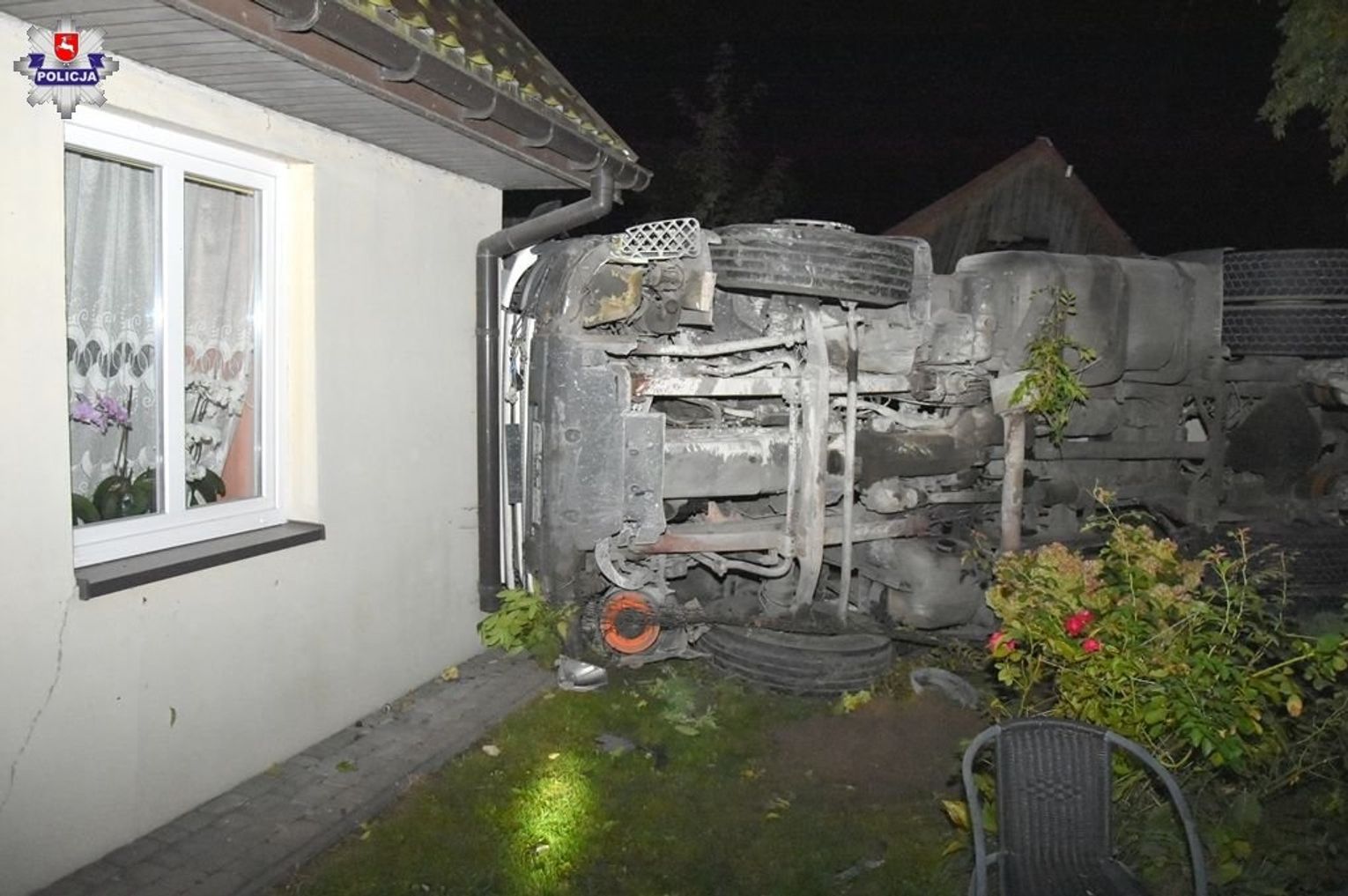 - Kierowca ciężarówki przewożącej cement, na zakręcie zjechał z drogi, przejechał przez bariery ochronne i uderzył w niezamieszkały dom. Po uderzeniu pojazd przejechał przez ogródek sąsiedniej posesji, gdzie ściął słup energetyczny, przewrócił się na bok i uderzył w kolejny dom, w którym przebywała kobieta. Na szczęście nikt nie doznał obrażeń. Samochód uszkodził tylko elewację budynku - relacjonuje Janusz Majewski, rzecznik KMP w Kraśniku.