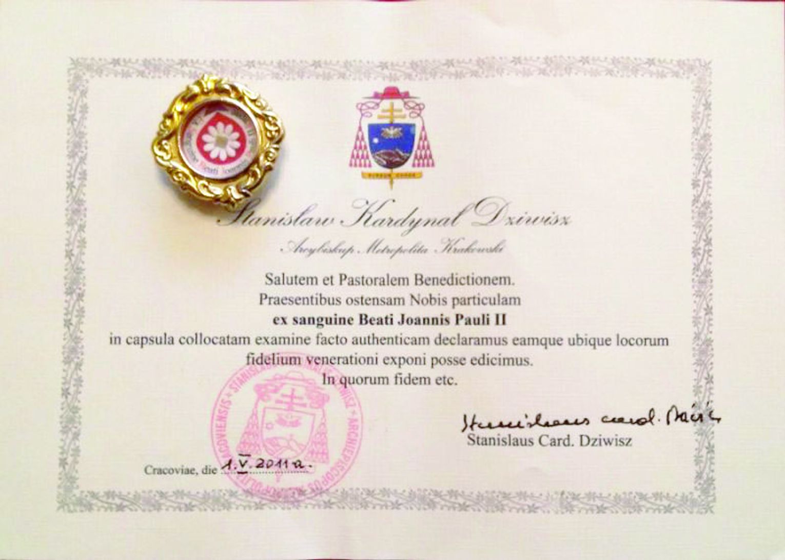 - Relikwia, którą otrzymaliśmy, to kropla krwi świętego Jana Pawła II – mówi ksiądz proboszcz Marek Chodorowski. - Jej autentyczność potwierdzona została certyfikatem podpisanym przez kardynała Stanisława Dziwisza, wieloletniego sekretarza i kapelana — najpierw arcybiskupa metropolity krakowskiego Karola Wojtyły, a później osobistego sekretarza papieża Jana Pawła II.