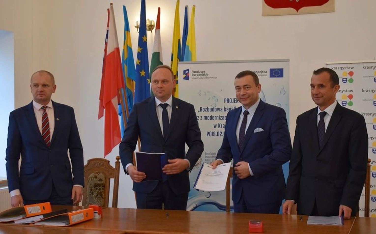 Umowa na realizację zadania pod nazwą "Modernizacja gospodarki osadowej na oczyszczalni ścieków w Krasnymstawie - etap I" została podpisana 19 listopada w Urzędzie Miasta Krasnystaw. W spotkaniu udział wzięli: burmistrz Robert Kościuk, prezes Przedsiębiorstwa Gospodarki Komunalnej w Krasnymstawie Andrzej Kmicic oraz przedstawiciele firmy Inżynieria Rzeszów S.A., która będzie wykonawcą inwestycji.