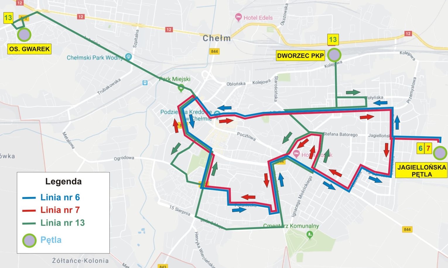 Autobusy linii nr 6 i nr 7 będą kursowały tylko w jednym, przeciwnym do siebie kierunku. Trasa linii nr 6: Jagiellońska Pętla – Rolnicza – 11 Listopada – I Pułku Szwoleżerów – Pl. Gdański – AK – Lwowska – Droga Męczenników – Połaniecka – Wolności – Wojsławicka – Żołnierzy I AWP – Hrubieszowska – Litewska – Ogrodnicza – Łowiecka – Jagiellońska Pętla. Trasa linii nr 7: Jagiellońska Pętla – Łowiecka – Ogrodnicza – Litewska – Hrubieszowska – Wiejska – Batorego – Żwirki i Wigury – Żołnierzy I AWP – Wojsławicka – Wolności – Połaniecka – Droga Męczenników – Lwowska – AK – Lubelska – Młodowskiej – I Pułku Szwoleżerów – 11 Listopada – Rolnicza – Jagiellońska Pętla.