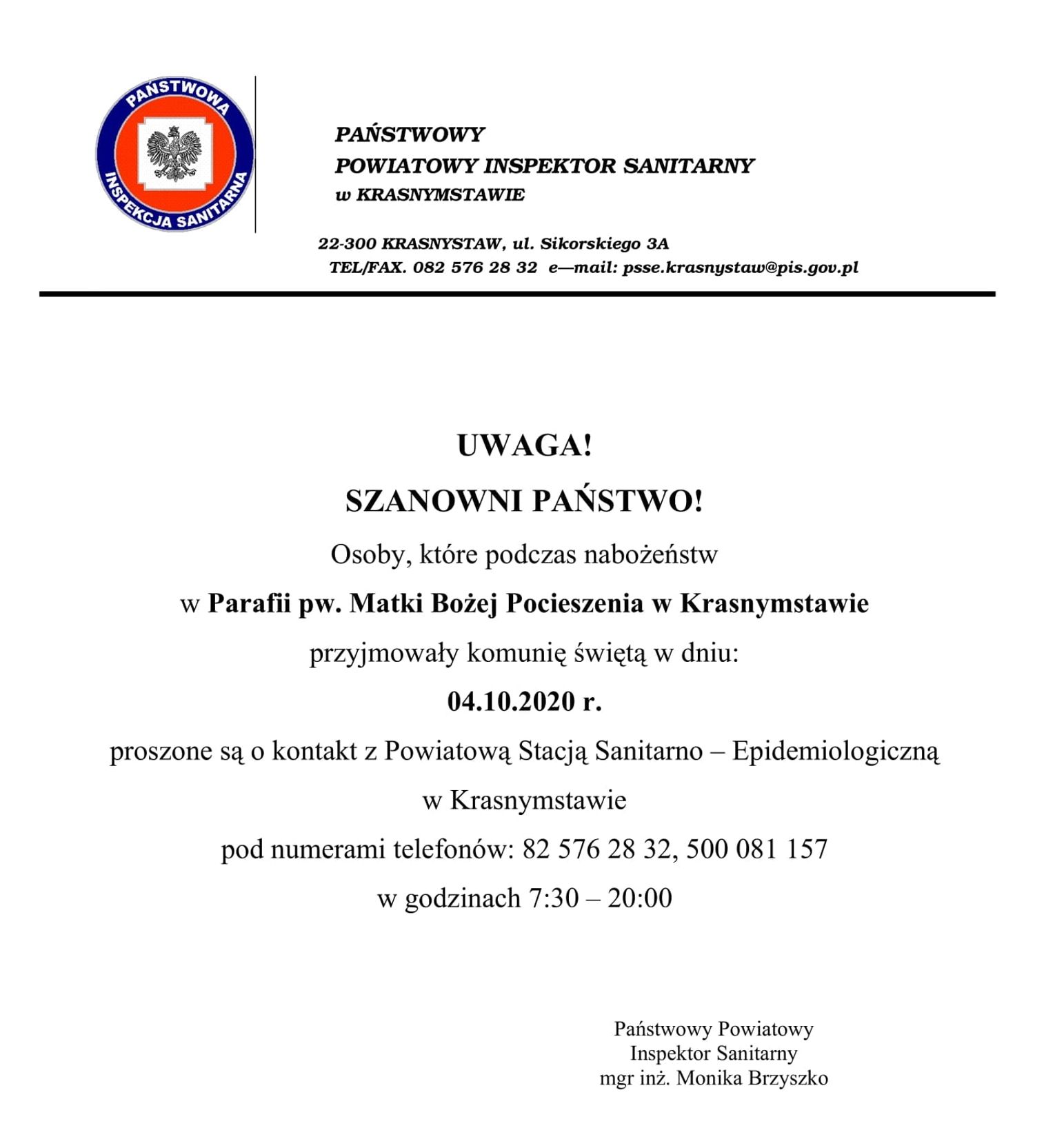 - Osoby, które podczas nabożeństw 4 października przyjmowały komunię świętą, proszone są o kontakt z Powiatową Stacja Sanitarno-Epidemiologiczną w Krasnymstawie pod numerami telefonów: 82 576 28 32 lub 500 081 157 w godzinach od 7.30 do 20 - informuje Monika Brzyszko, szefowa PSSE Krasnystaw.