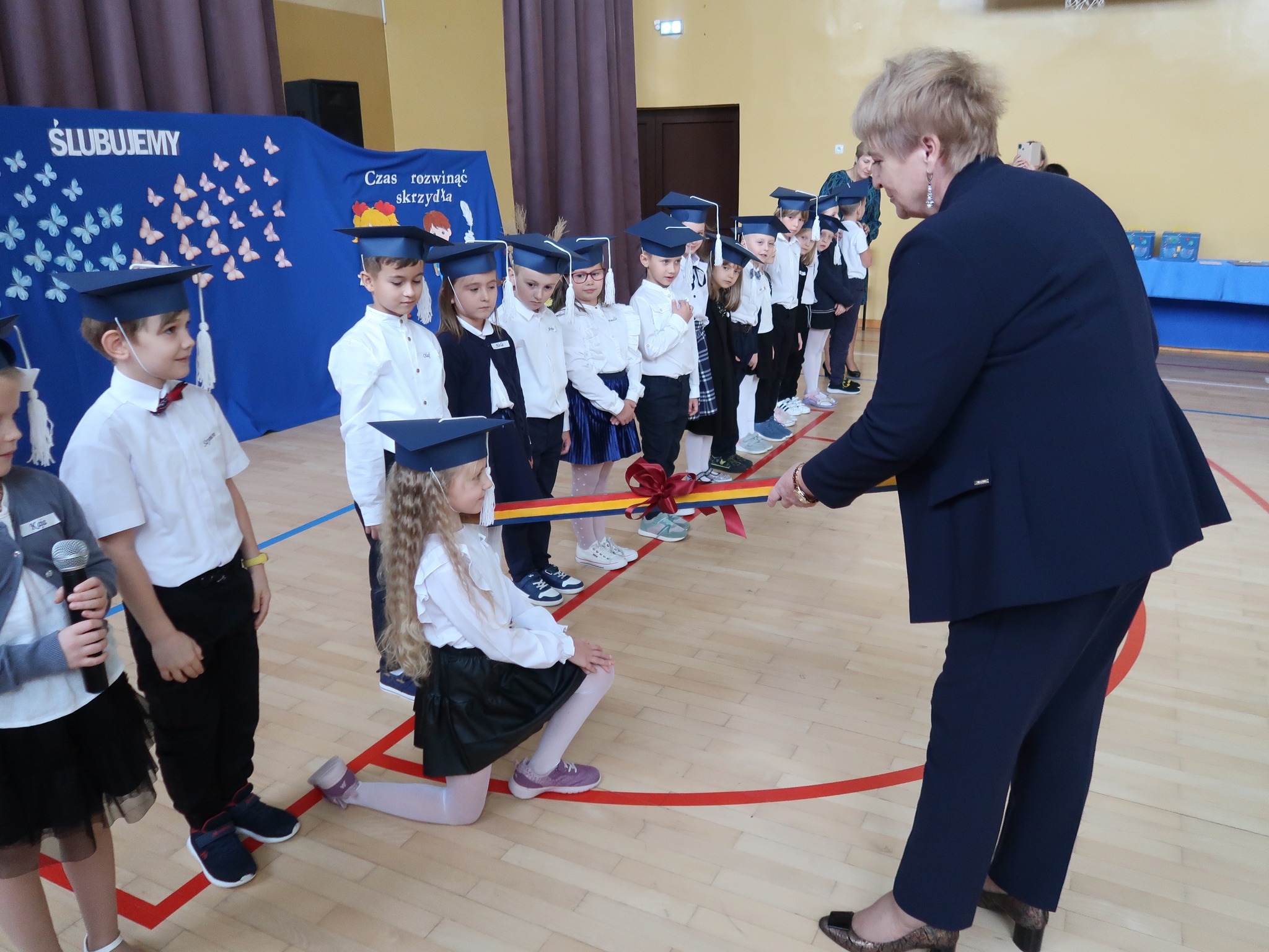 - Wszyscy wzorowo zdali test wiedzy, który przygotowali im starsi koledzy oraz bardzo dobrze zaprezentowali się w częściach artystycznych, które były przygotowane przez wychowawczynie. Następnie złożyli ślubowanie na sztandar szkoły oraz zostali pasowani przez dyrektorów . Z okazji ślubowania pierwszoklasiści otrzymali również upominki od zaproszonych gości i rodziców. Wszystkim pierwszakom życzę wyłącznie ocen celujących i bardzo dobrych, samych słonecznych i radosnych dni oraz wielu miłych niezapomnianych wrażeń - napisał na swoim profilu facebookowym wójt Dariusz Stocki.