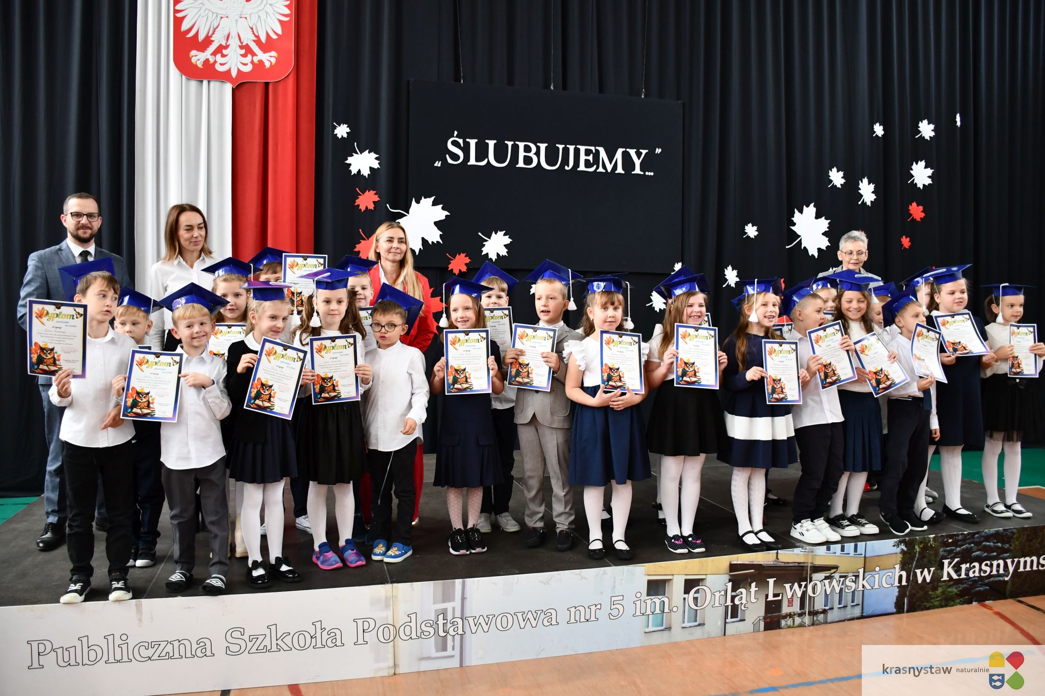 14 listopada pierwszoklasiści z Publicznej Szkoły Podstawowej nr 5 im. Orląt Lwowskich w Krasnymstawie zostali przyjęci w poczet uczniów. Pasowania dokonał Daniel Miciuła - burmistrz Krasnegostawu wraz z dyrektor Sylwią Młynarczyk-Rysak.