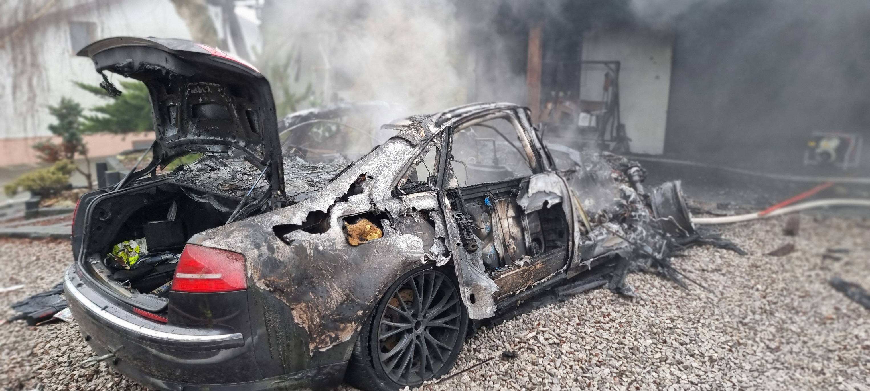 Auto stanęło w płomieniach. Palił się też garaż. Wezwano 6 zastępów strażaków [ZDJĘCIA]