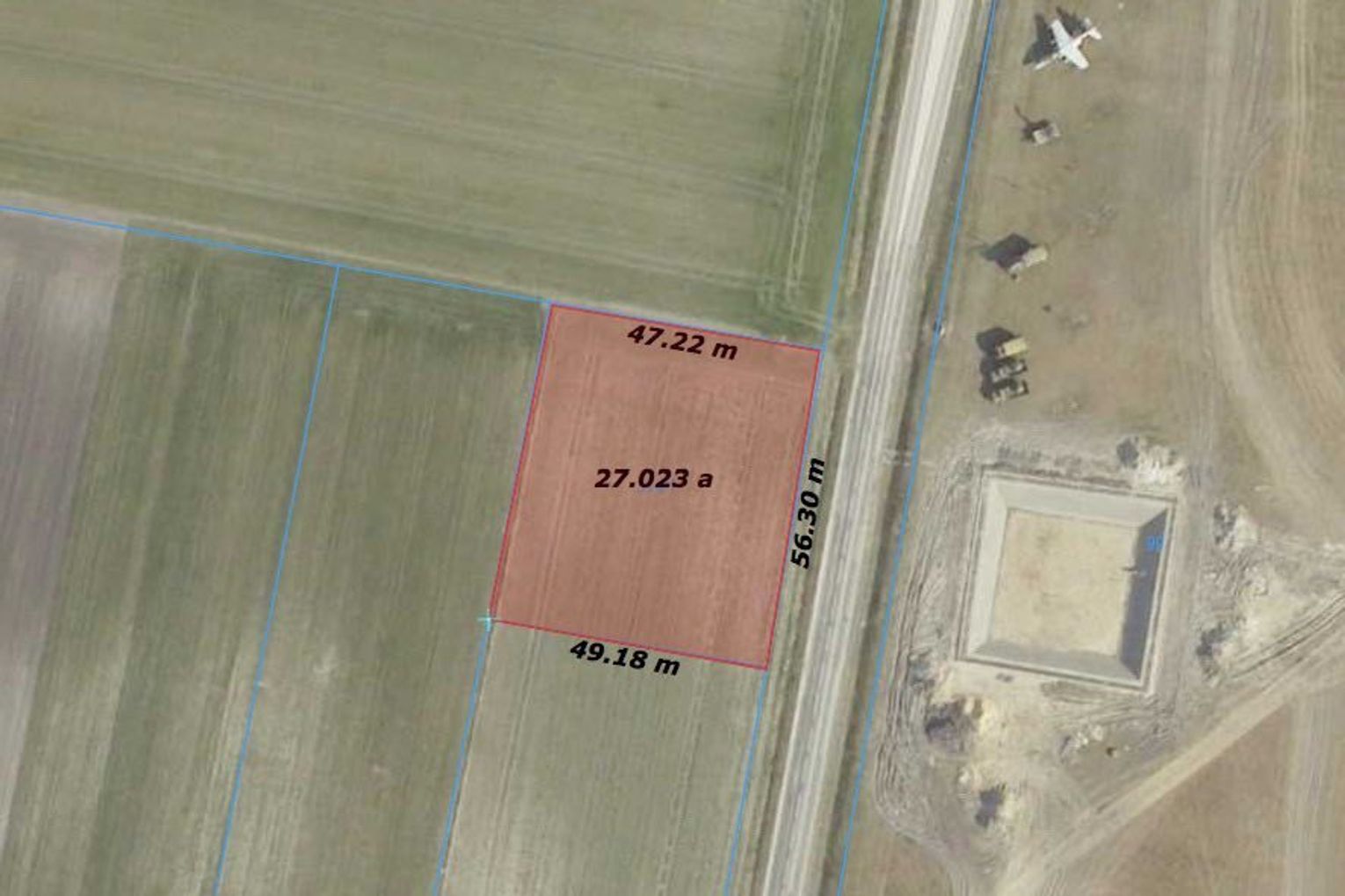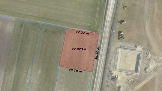 Działka o powierzchni 27 arów o kształcie kwadratu o szerokości 49m i długości 56,30m z dostępem do drogi głównej asfaltowej.