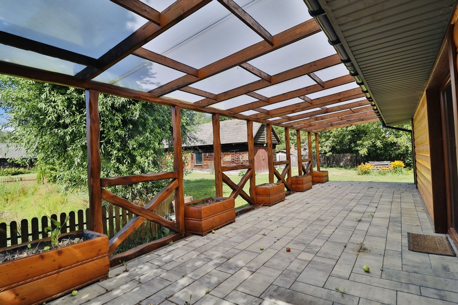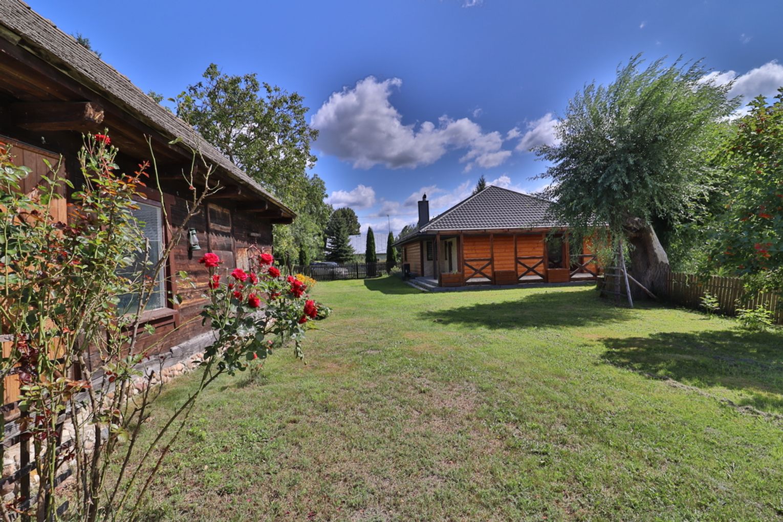 Zadaszony taras oraz piękny ogród ze stawem i dwoma starymi wierzbami zachęcają do relaksu na świeżym powietrzu.
