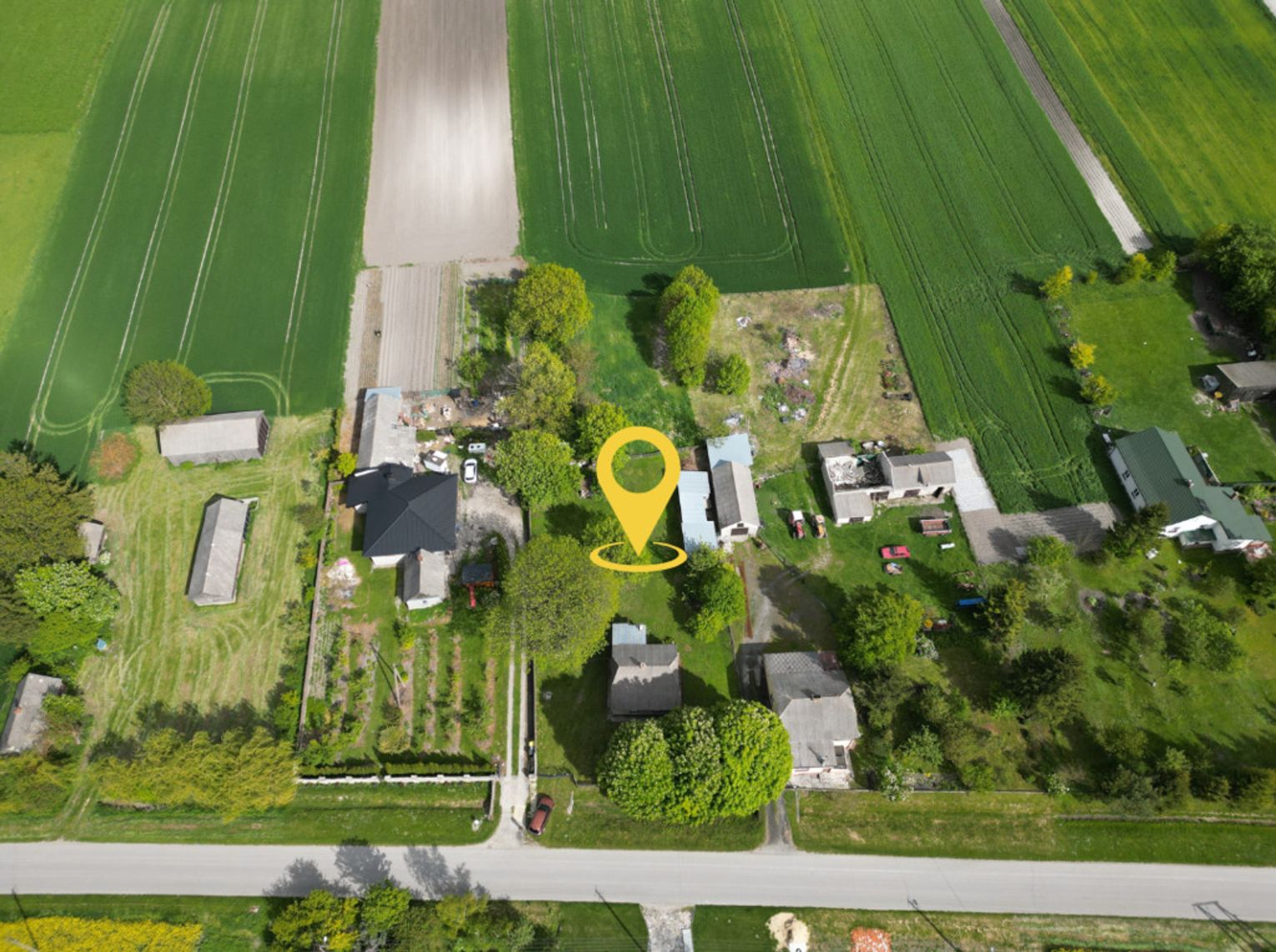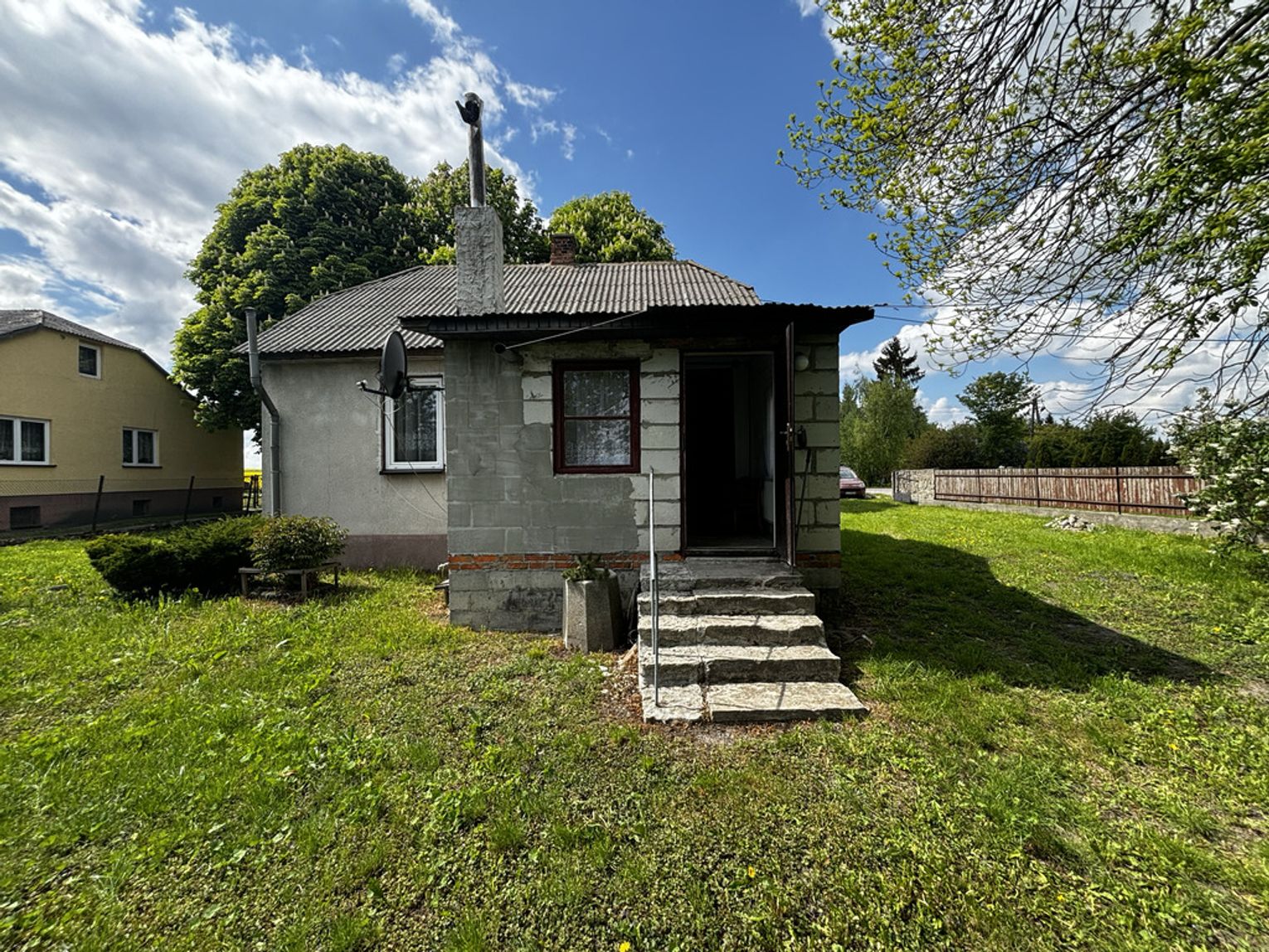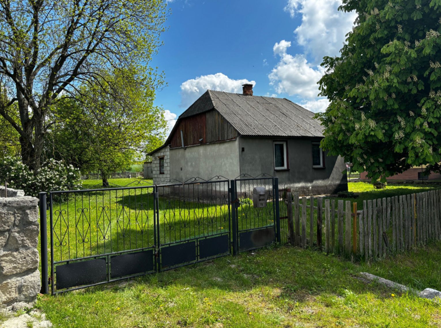 Dojazd drogą asfaltową. Podwórko ogrodzone, z bramą wjazdową i furtką.