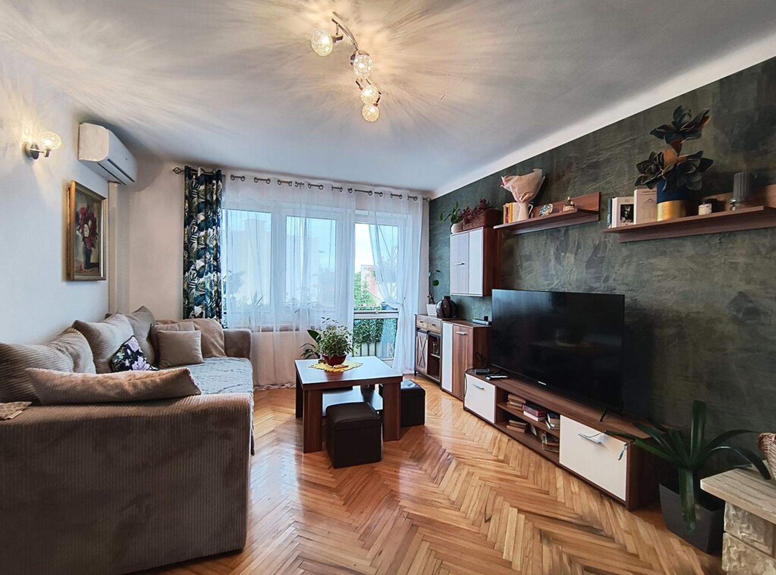 - Salon z kominkiem, klimatyzacją i wyjściem na balkon – idealny do relaksu o każdej porze roku