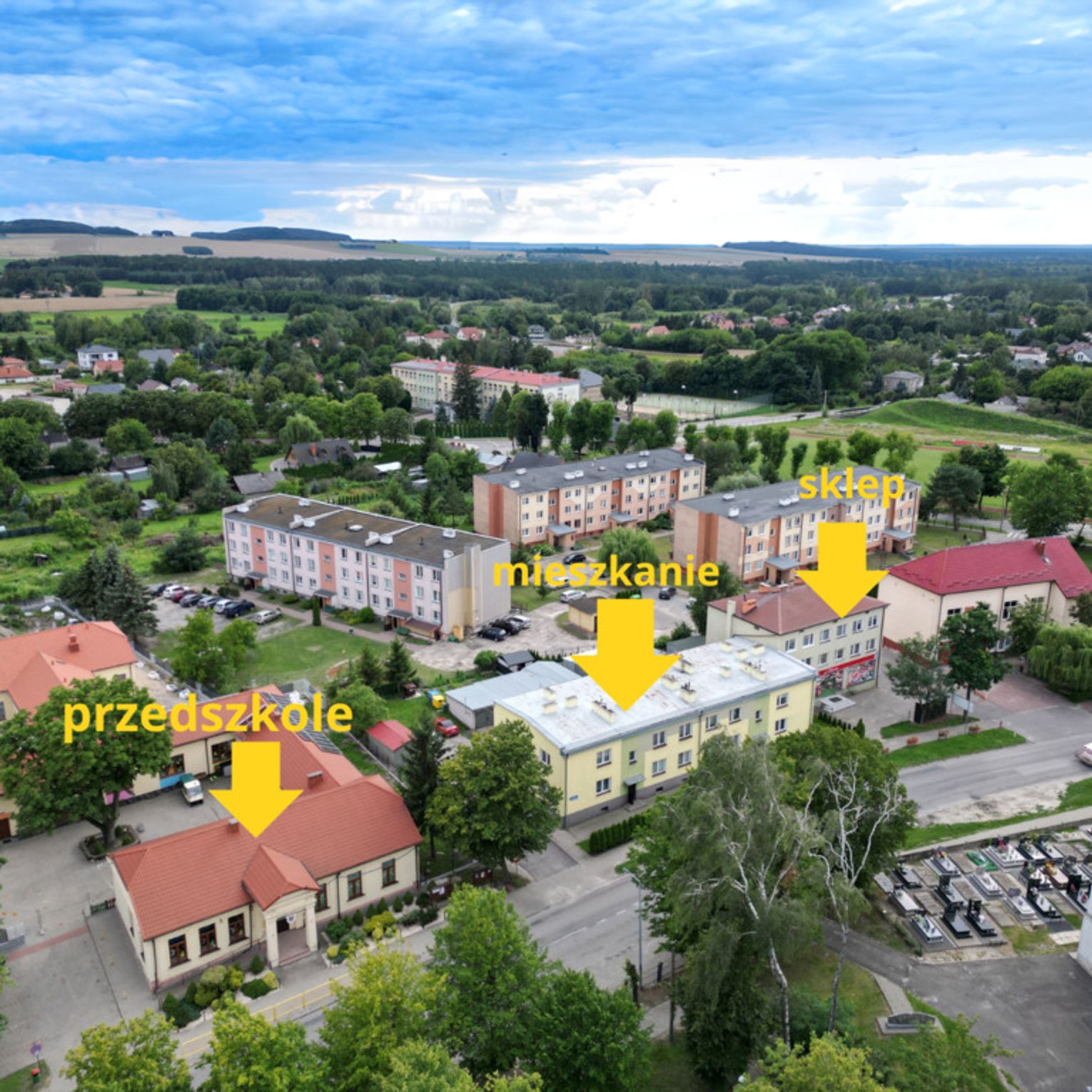 - Bardzo dobra lokalizacja – w pobliżu sklepy, przedszkole, szkoła, przystanek autobusowy, kościół