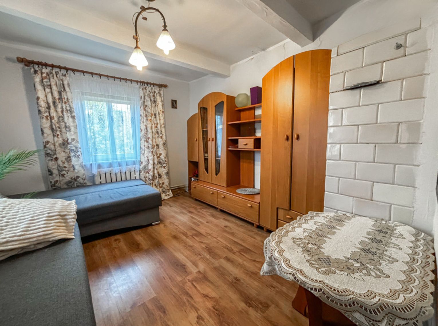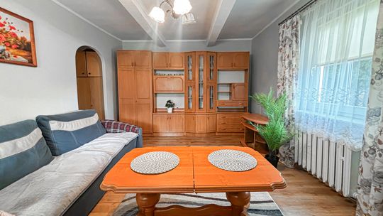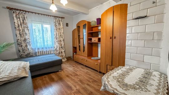 Dom drewniany obmurowany, docieplony styropianem z oknami PCV i wymienionym poszyciem dachowym.