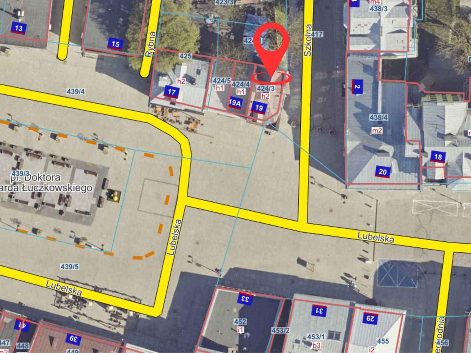 Nieruchomość położona jest u zbiegu ulic Lubelskiej i Szkolnej- z wejściem od ulicy Szkolnej.