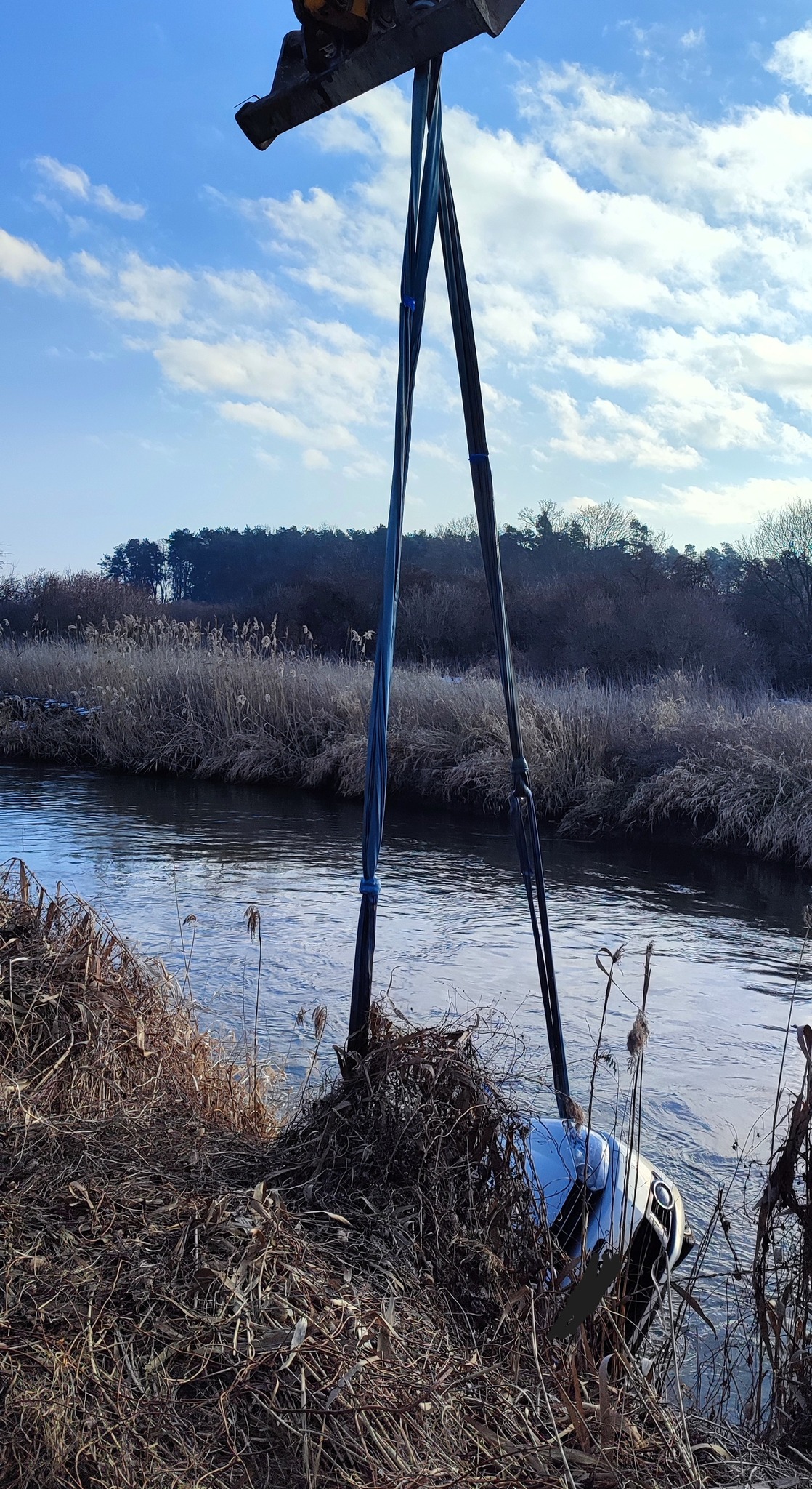 Pow. krasnostawski. 47-latek wjechał autem do Wieprza. Chciał sprawdzić poziom wody [GALERIA ZDJĘĆ]