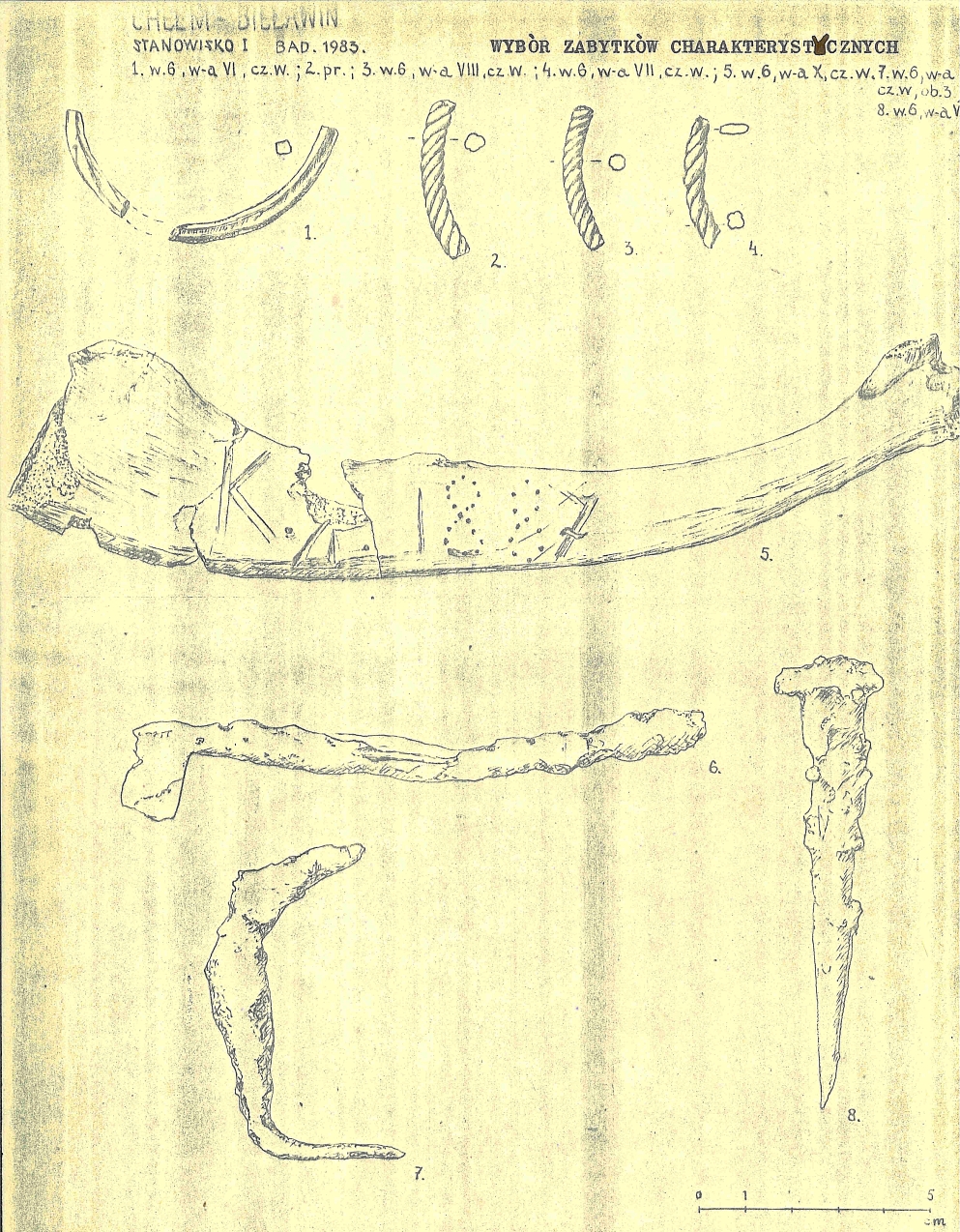 Bieławin, wybór zabytków charakterystycznych z badań archeologicznych wieży w 1983 r.; od góry: bransolety szklane z XIII w., żebro bydlęce (?) z napisem, skobel żelazny, gwóźdź; Stanisław Gołub, „Chełm – Bieławin. Stan. I. Sezon 1983. Wybór dokumentacji”, Chełm 1983 r., rys. Krystyna Mart, archiwum Delegatury WUOZ w Chełmie.